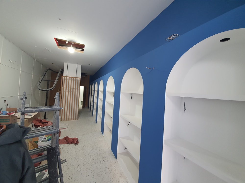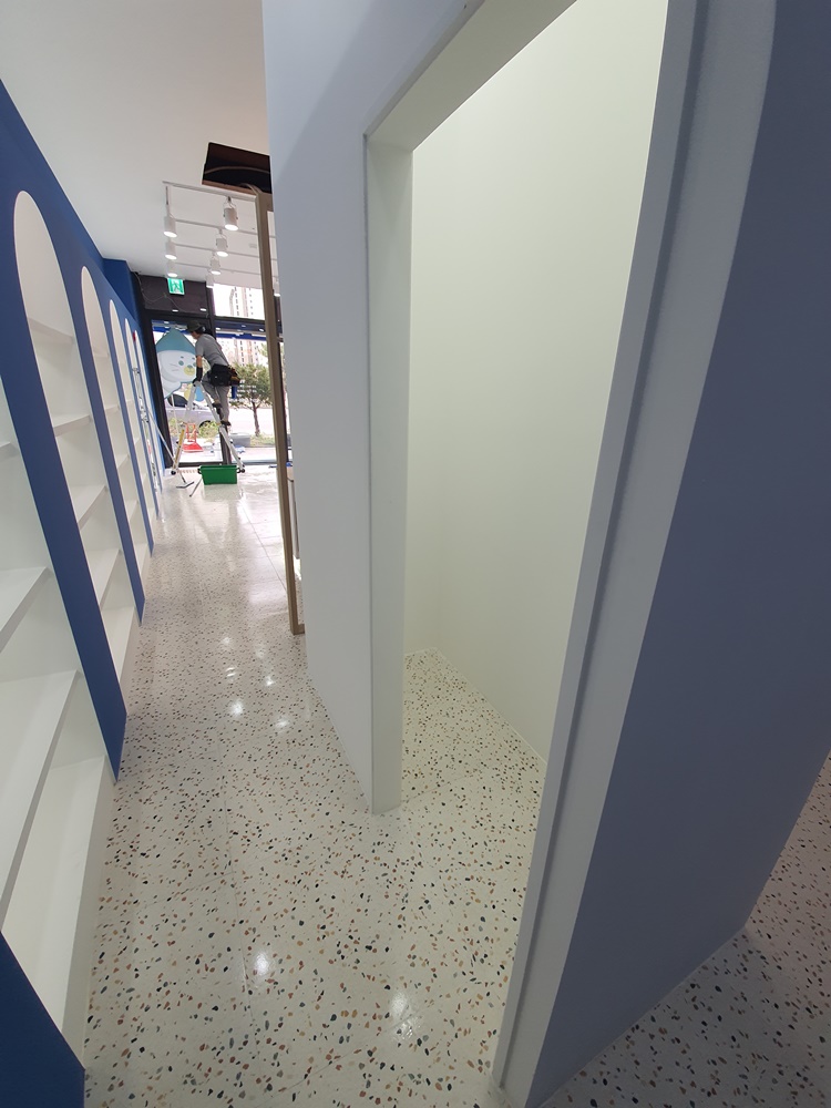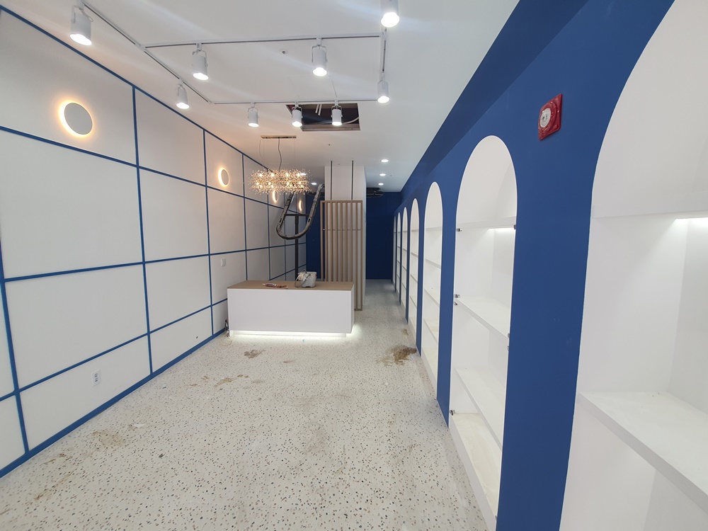 화이트 마감과 블루 도장이 잘 어우러져 특색있는 공간으로 완성된 모습입니다. 벽면은 화이트로 마감하고 진열장과 같은 색인 블루로 격자 무늬 디자인 작업을 진행해 깔끔한 느낌을 부각했고 바닥은 최근 다시 유행하고 있는 테라조 무늬로 마감해 트렌디한 분위기를 연출하고 있습니다. 조명은 천장 레일 조명과 벽면 포인트 조명을 간접등으로 시공해 은은하면서 세련된 분위기를 연출했고 카운터 공간에는 팬던트형 디자인 조명을 시공했습니다.