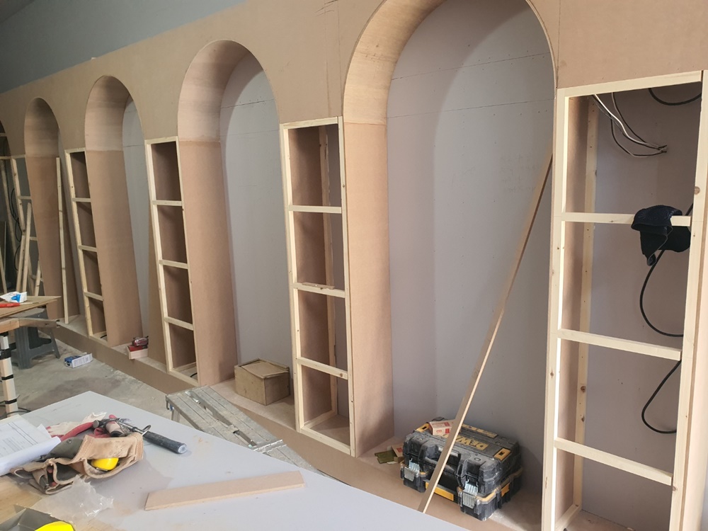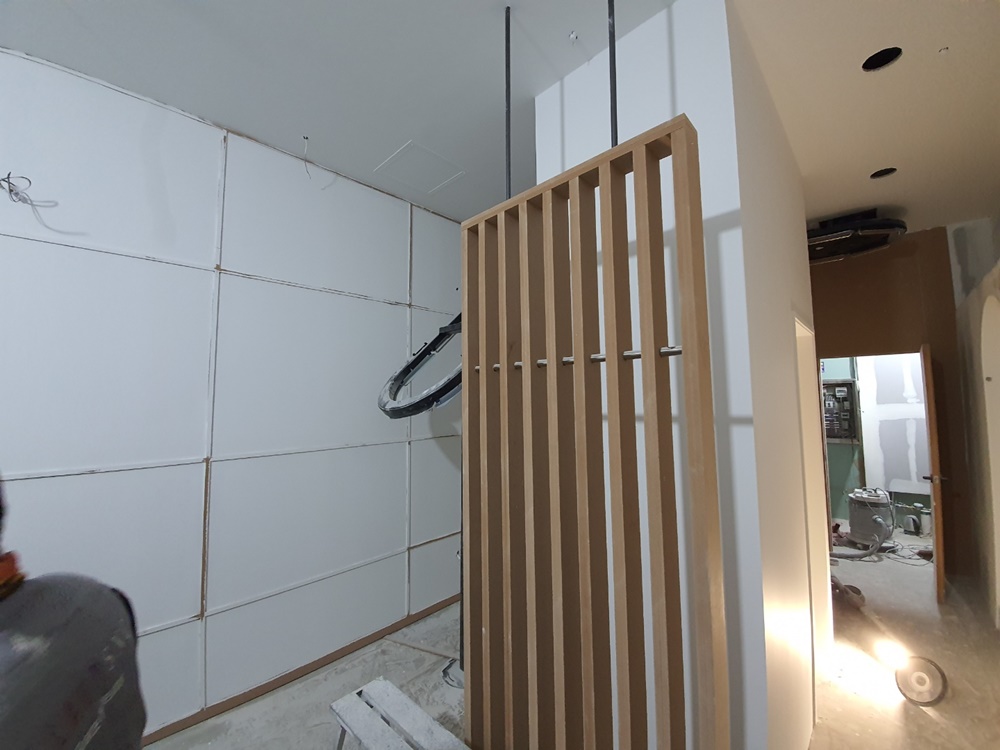 공사가 시작되면 기존 시설물과 불필요한 구조물은 철거를 하고 천장 배선, 배관, 공조, 소방 등의 시설을 점검하고 정리한 후 목공 작업을 진행하게 됩니다. 목공 작업에는 레이아웃에 맞춰 구조를 나누는 작업과 공간에 멋을 주는 치장을 하는 작업이 있습니다. 벽면에 빌트인으로 설치하는 가구나 아트월, 조형물 등은 치장 작업에 속하는데요, 이런 모든 작업은 안전 시공이 중요하기 때문에 베테랑 전문인력과 함께 공사를 진행하고 있습니다.