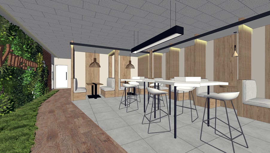 공간의 구성은 첫 번째 시안과 마찬가지로 벽면을 따라 부스형 공간이 배치됐고 중앙에 긴 테이블을 두었으며 자연적인 소재인 우드, 라탄 등을 적용해 싱그럽고 힐링할 수 있는 공간을 조성했습니다. 하남 미사 테크노밸리 u1 센터 입주를 앞두고 사무실인테리어를 계획 중이시거나 카페같은사무실 디자인을 인테리어에 적용하고 싶으시다면 저희 916디자인으로 문의해주세요. 합리적인 견적으로 퀄리티 높은 카페테리아 및 사무실 인테리어를 시공해드리겠습니다.