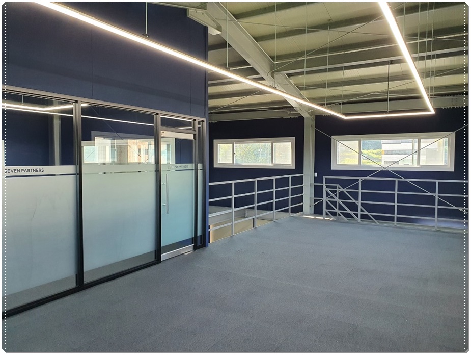 그래서 손이 더 많이 가더라도 H빔과 바닥 간살 시공은 용접으로 접합했고 합판으로 바닥을 시공해 걸을 때 안정적이고 안전할 수 있도록 했습니다. 복층 하지 작업이 끝난 후에는 판넬 공사를 진행해 사무실을 만들었고 판넬은 강도가 높은 골판넬을 적용했으며 실리콘으로 코킹 처리까지 깔끔하게 했습니다.