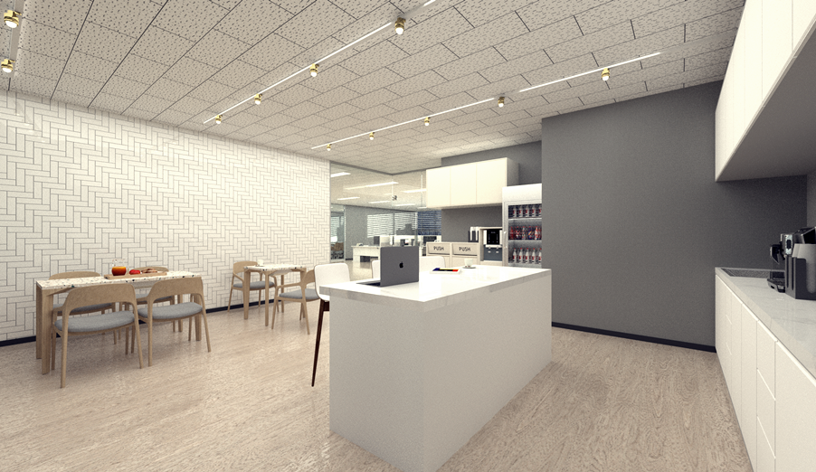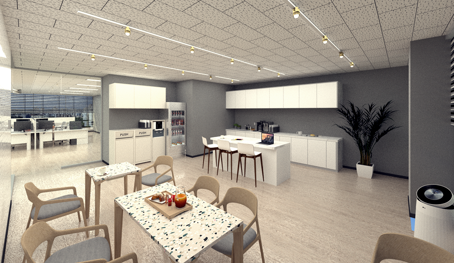 카페테리아입니다. 최근 일 할 땐 일하고 쉴 땐 쉴 수 있는 기업 문화가 유행하면서 자유로운 분위기에서 편하게 쉴 수도 있고 방문객을 응대할 수도 있고 자유로운 업무를 진행할 수 있는 카페테리아가 사무실인테리어 트렌드입니다.
