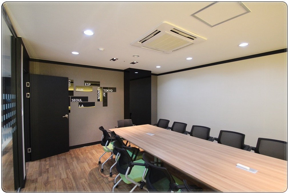 다른 벽면에는 각 나라의 주요 도시명이 적힌 아크릴 모형을 디자인해 포인트를 줬는데요, 글래스 보드를 시공한 벽면과 분위기가 많이 달라졌네요. 회의 테이블은 가볍고 부드러운 컬러로 배치했고 콘센트를 상판에 설치해 전선을 깔끔하게 정리할 수 있도록 배려했습니다. 물론, 이런 테이블 종류에 따라 인테리어 공사 비용은 달라지게 되는데요, 고객님께서 예산을 미리 알려주시면 그에 맞게 대안을 제시해드리고 있으니 부담갖지 마시고 언제든지 문의해 주시기 바랍니다.