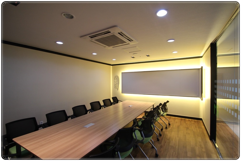회의실입니다. 전체적으로 블랙 & 화이트로 모던하게 꾸몄고 의자 그린 컬러로 포인를 줬습니다. 공용 사무공간과 같은 매입형 조명을 시공했고 한쪽 벽면에 글래스 보드를 시공해 간접 조명을 설치함으로써 은은한 분위기를 조성면서 동시에 사용성과 편리성을 높였습니다. 벽면에는 회사 로고를 부착해 정체성을 부여하고 가독성을 높였으며 직원들에게는 소속감을 느낄 수 있도록 의도했습니다.