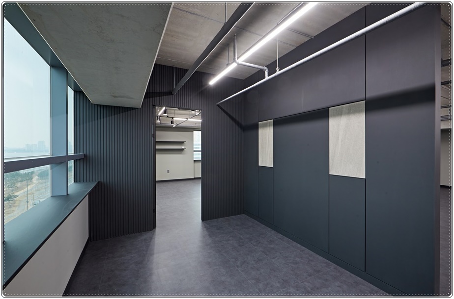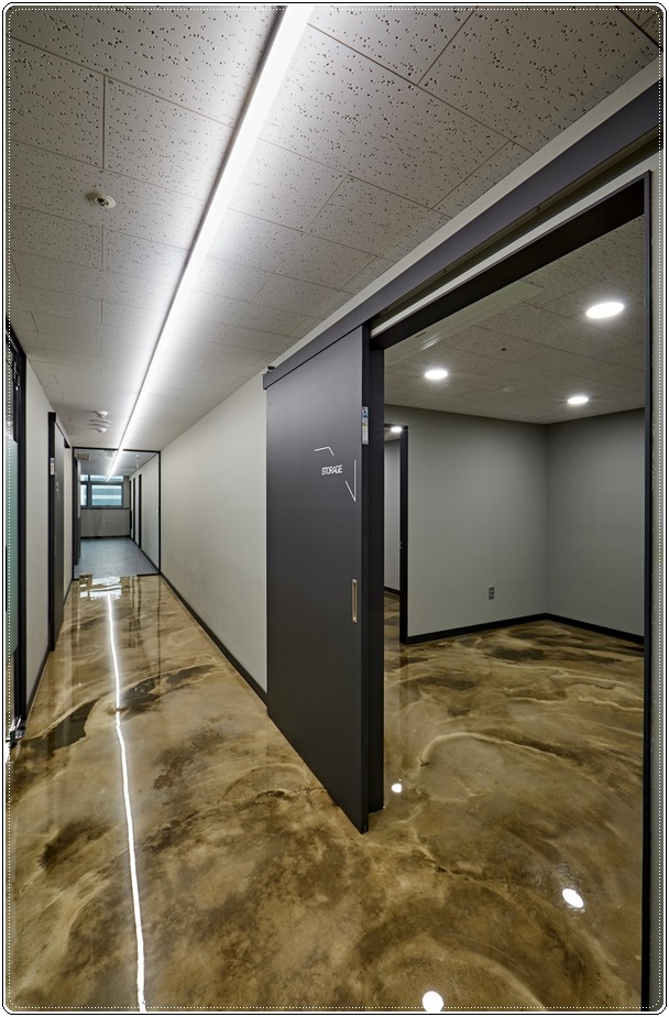 방문객 동선과 직원 동선이 나뉘는 곳의 바닥 마감을 달리해 영역성을 명확하게 하고 가독성을 높였습니다. 직원 동선의 복도는 아이보리 컬러의 벽면과 진그레이 바닥 그리고 블랙 컬러의 도어를 슬라이드로 시공해 깔끔하면서도 효율적인 공간 활용이 가능하도록 했습니다. 천장에는 동선을 따라 라인 조명을 시공해 어두운 곳 없이 충분한 조도를 확보함으로써 답답하고 좁아보이는 단점을 극복했습니다.