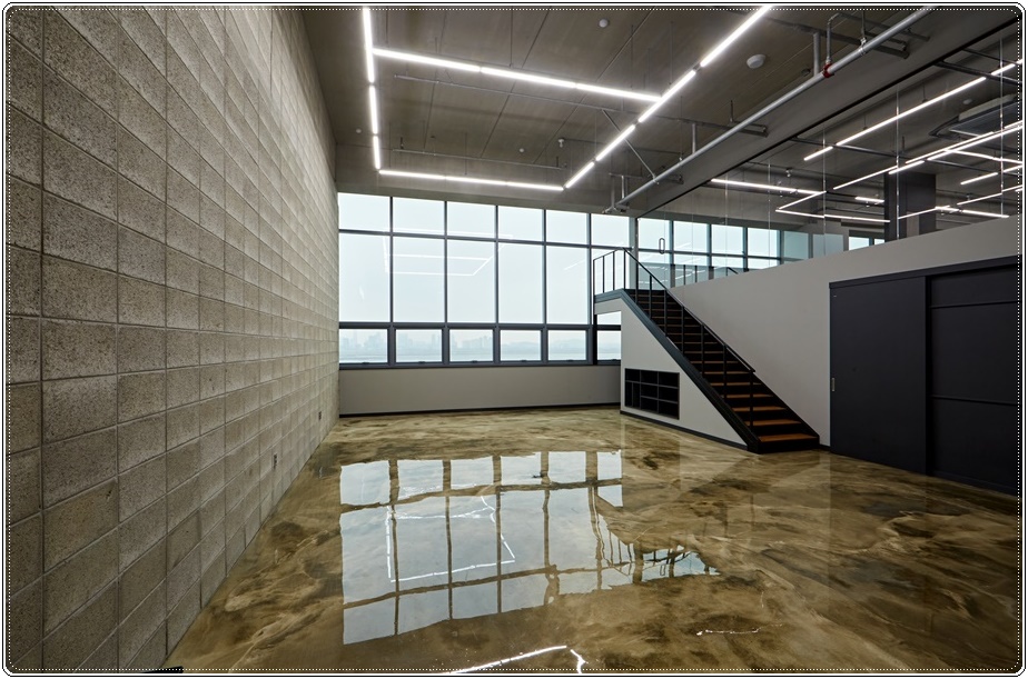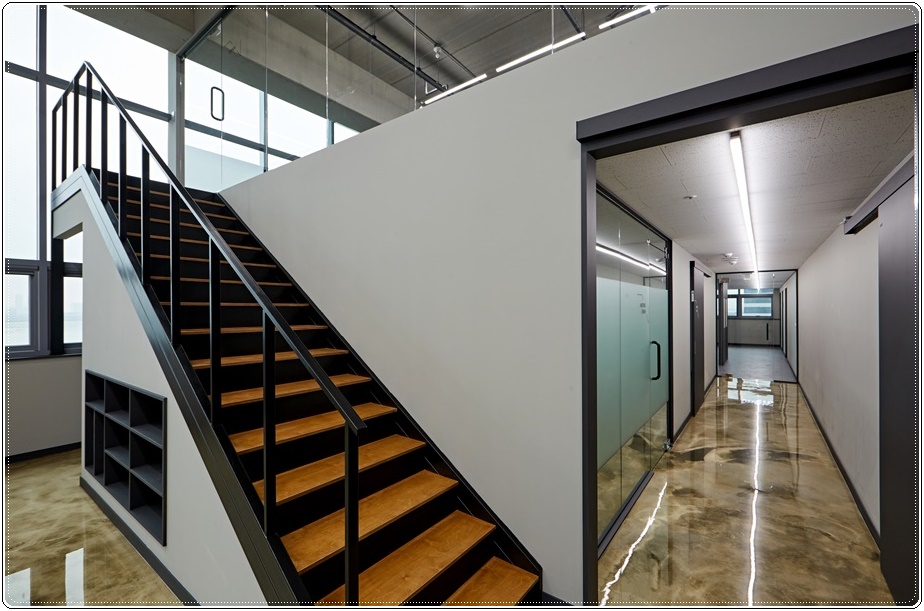 또한, 외부 방문객의 동선을 제한하기 위해서 회의실과 세미나실도 입구측에 배치하고 대표실과 임원실은 복층에 계획했으며 직원들은 가장 안쪽 공간에 사무실을 배치해 아무 방해없이 근무하고 업무 효율을 높일 수 있도록 했습니다. 층고 확보를 위해 노출천장으로 시공하고 벽면에 석재로 마감해 인더스트리얼 컨셉트를 적용했고 단층의 로비공간과 복층 하부의 방문객 동선까지의 바닥은 유광의 빈티지 노출로 마감해 영역성을 명확히 했습니다.