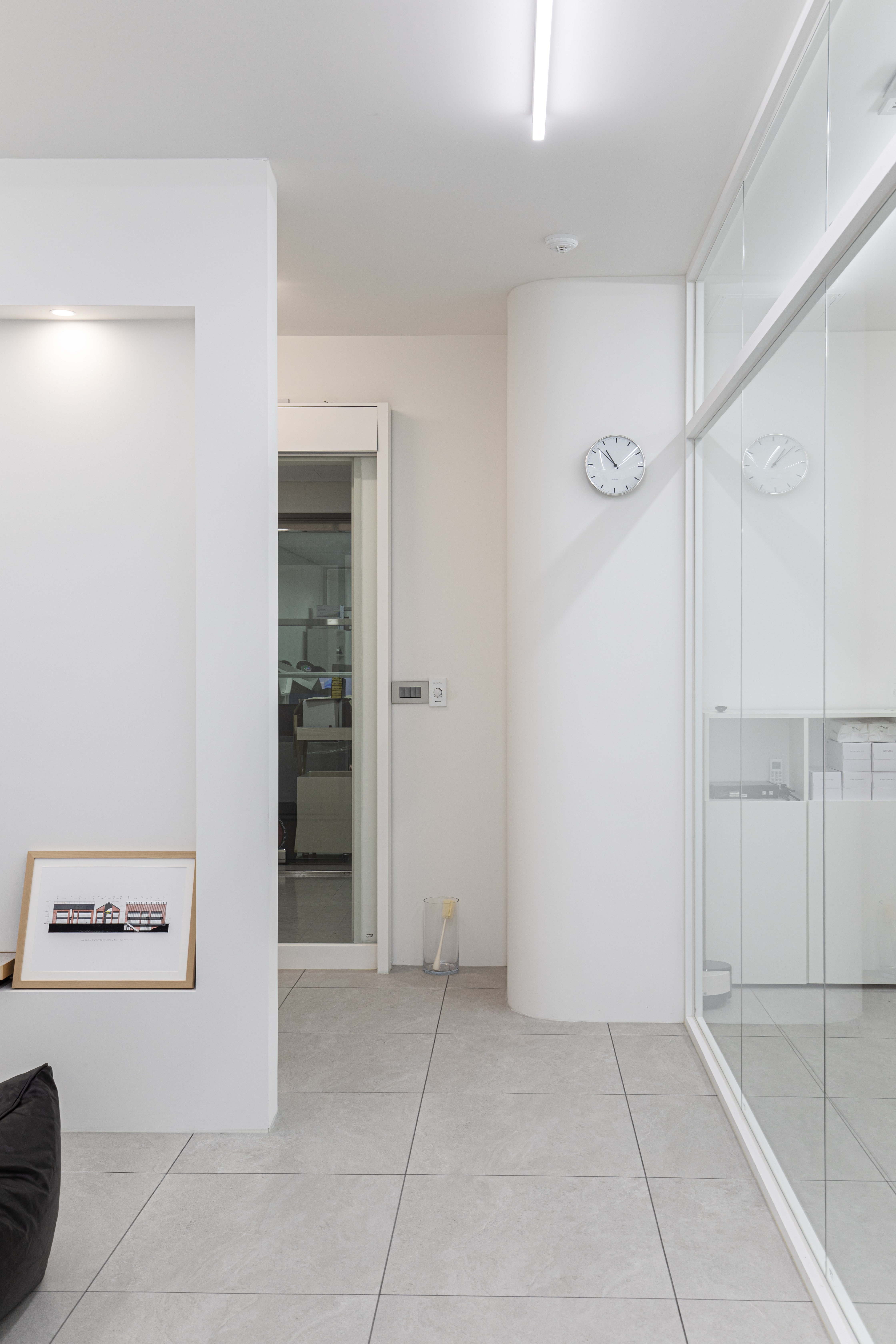 원형 벽등의 은은한 조명과 투명 유리를 통한 시선 개방으로, 사무실에 들어서는 순간부터 공간의 세련됨과 친근함을 느낄 수 있도록 설계했어요.