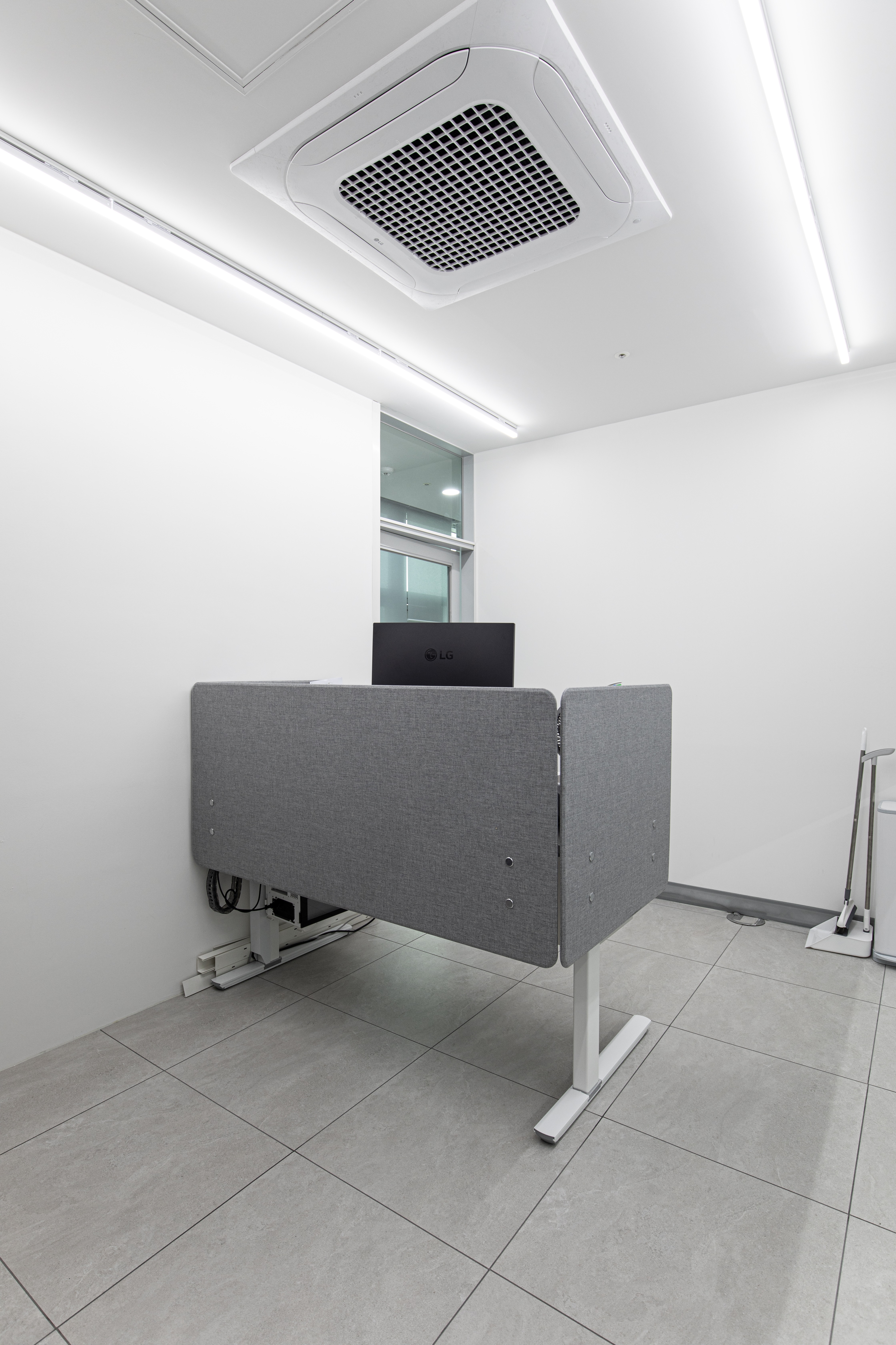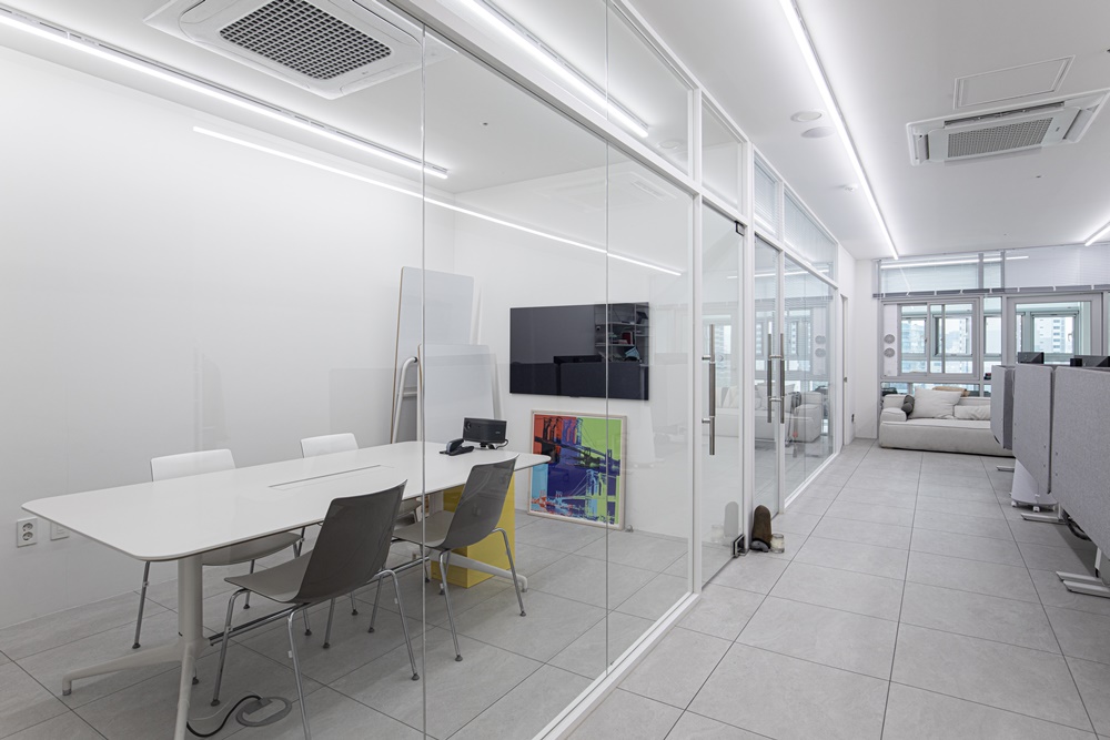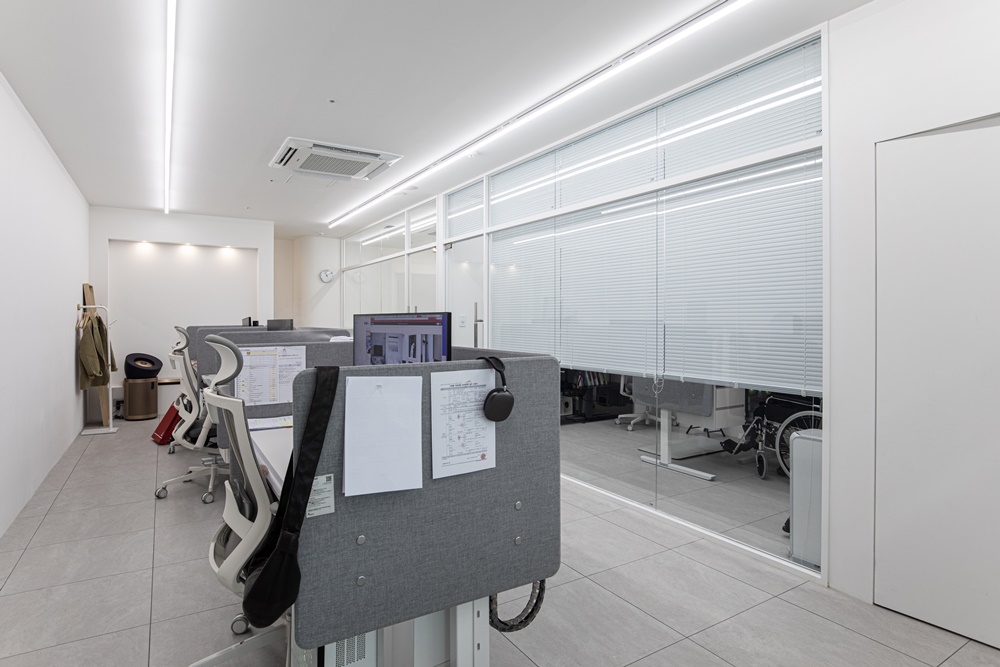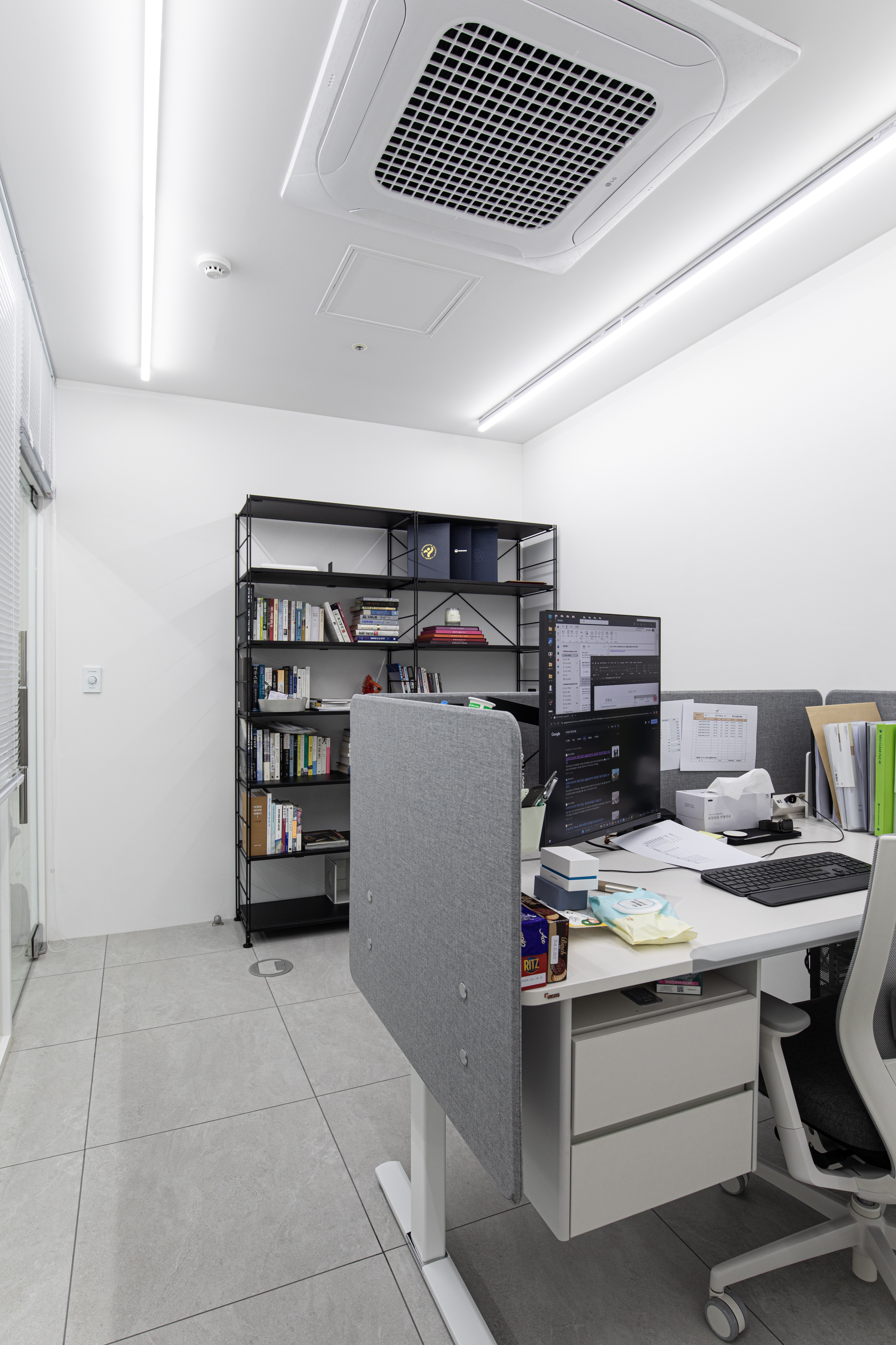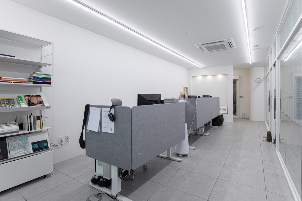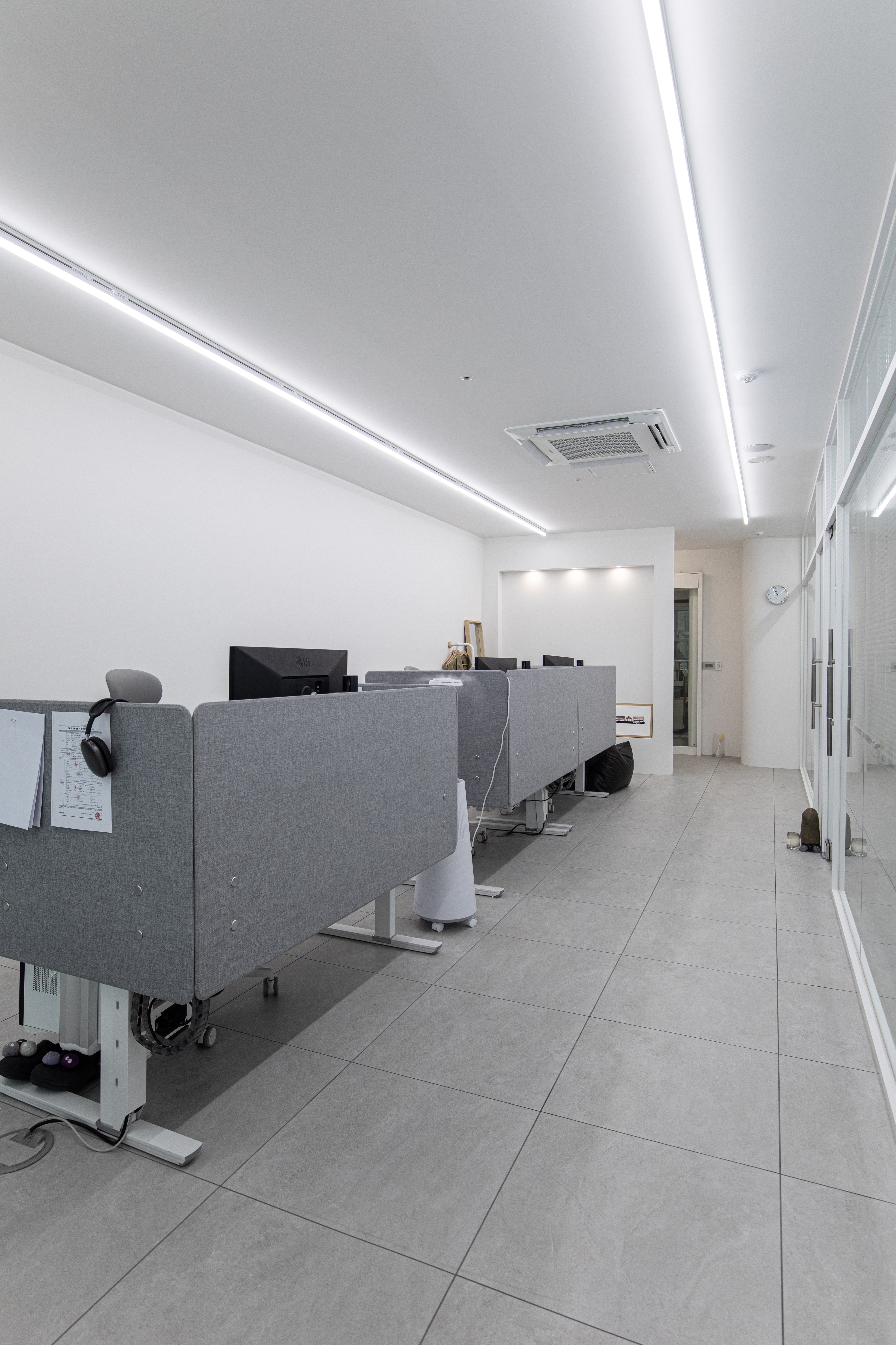 이 사무 공간은 깔끔한 라이트 그레이 타일 바닥과 흰 벽면으로 시각적 안정감과 청결함을 더했고 천장에 설치된 선형 LED 조명은 밝고 균일한 빛으로 집중력을 지원합니다.