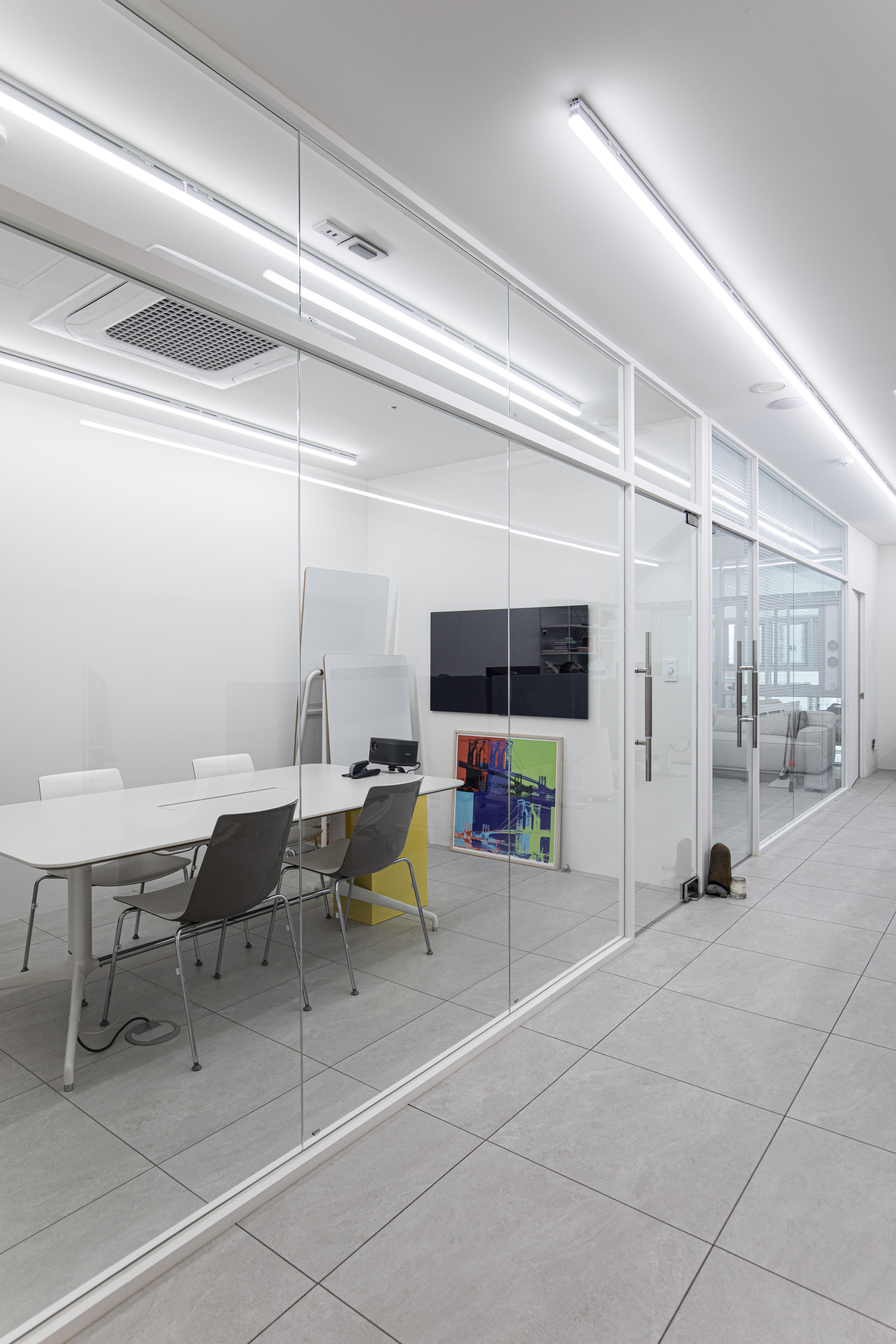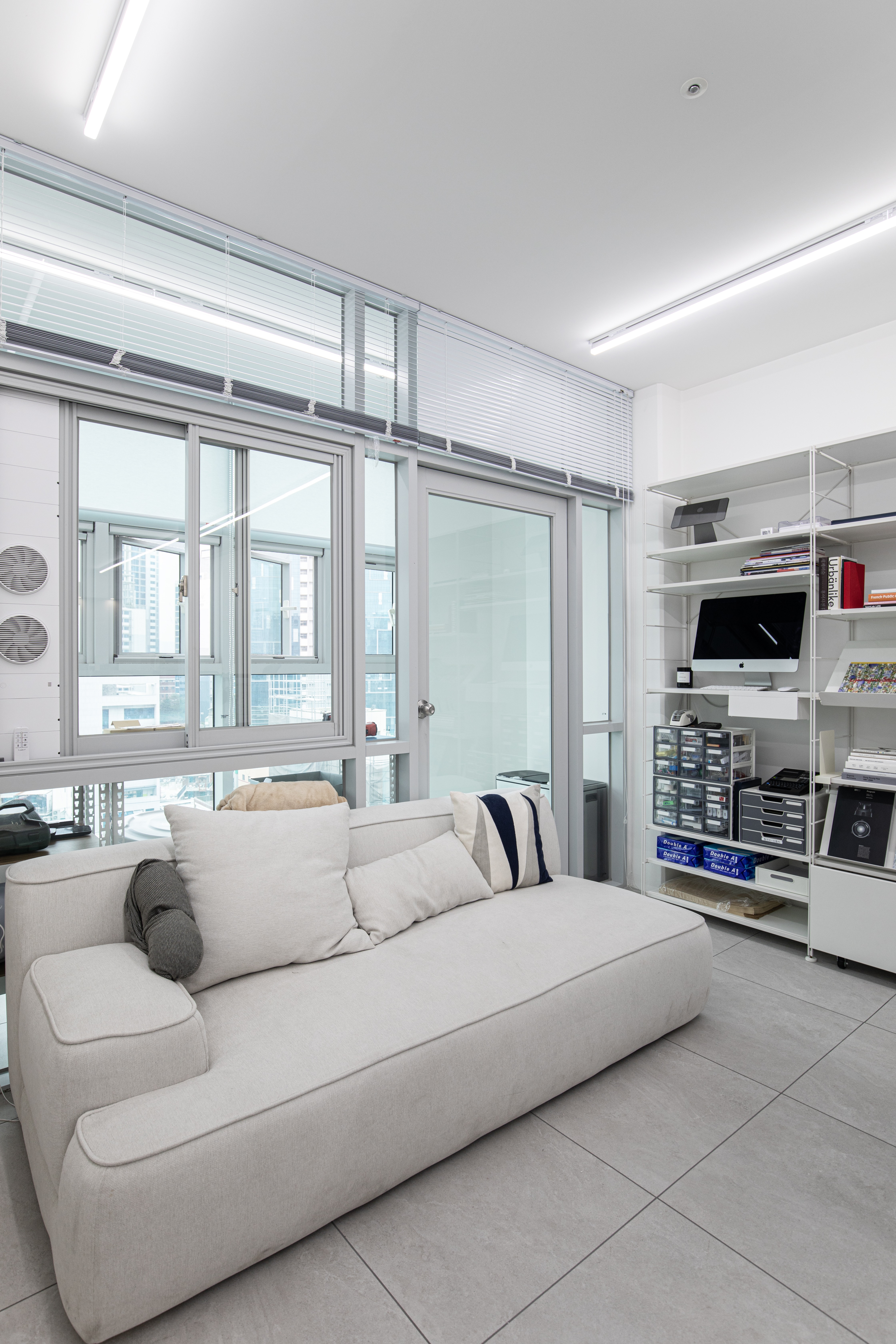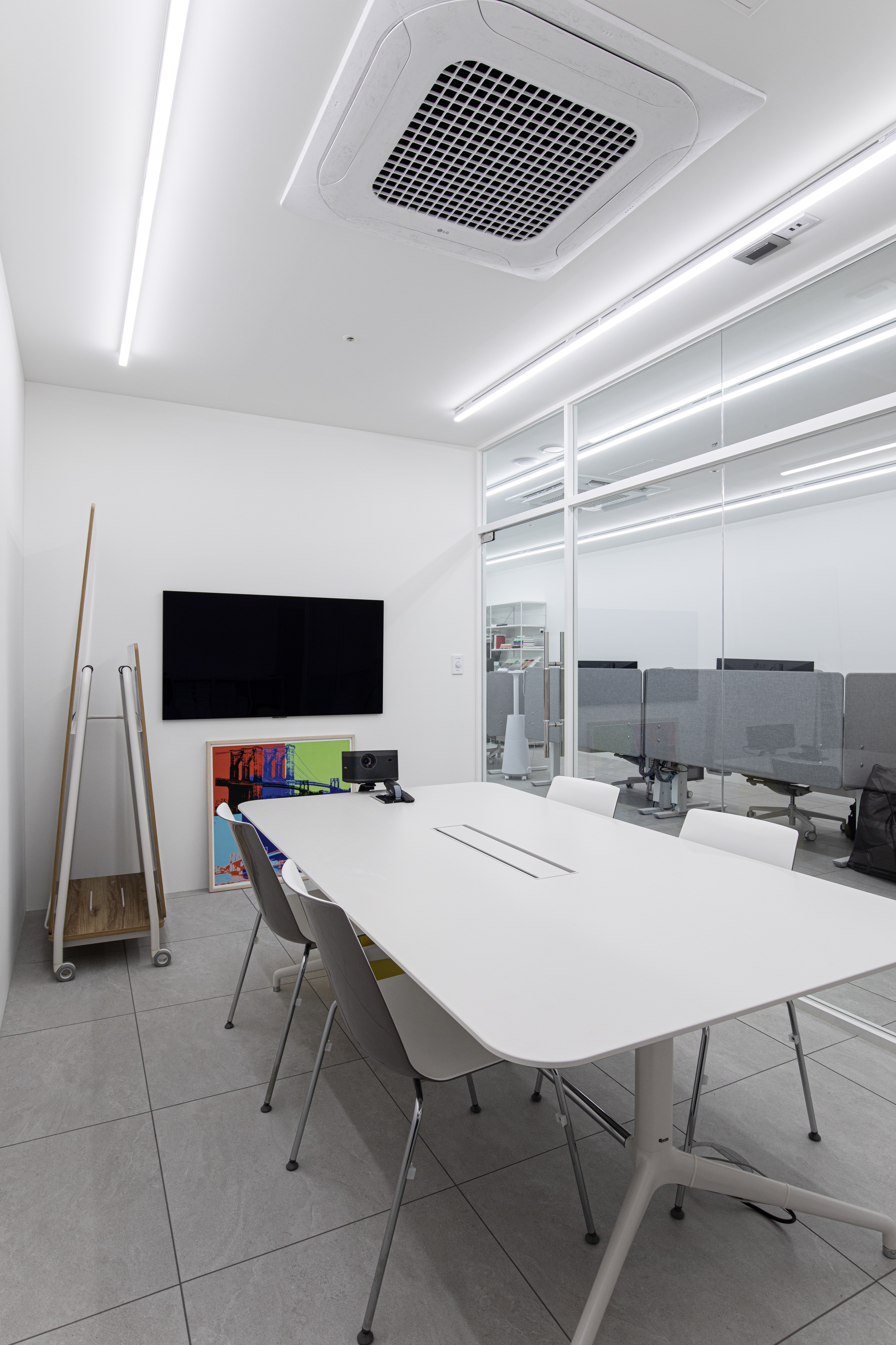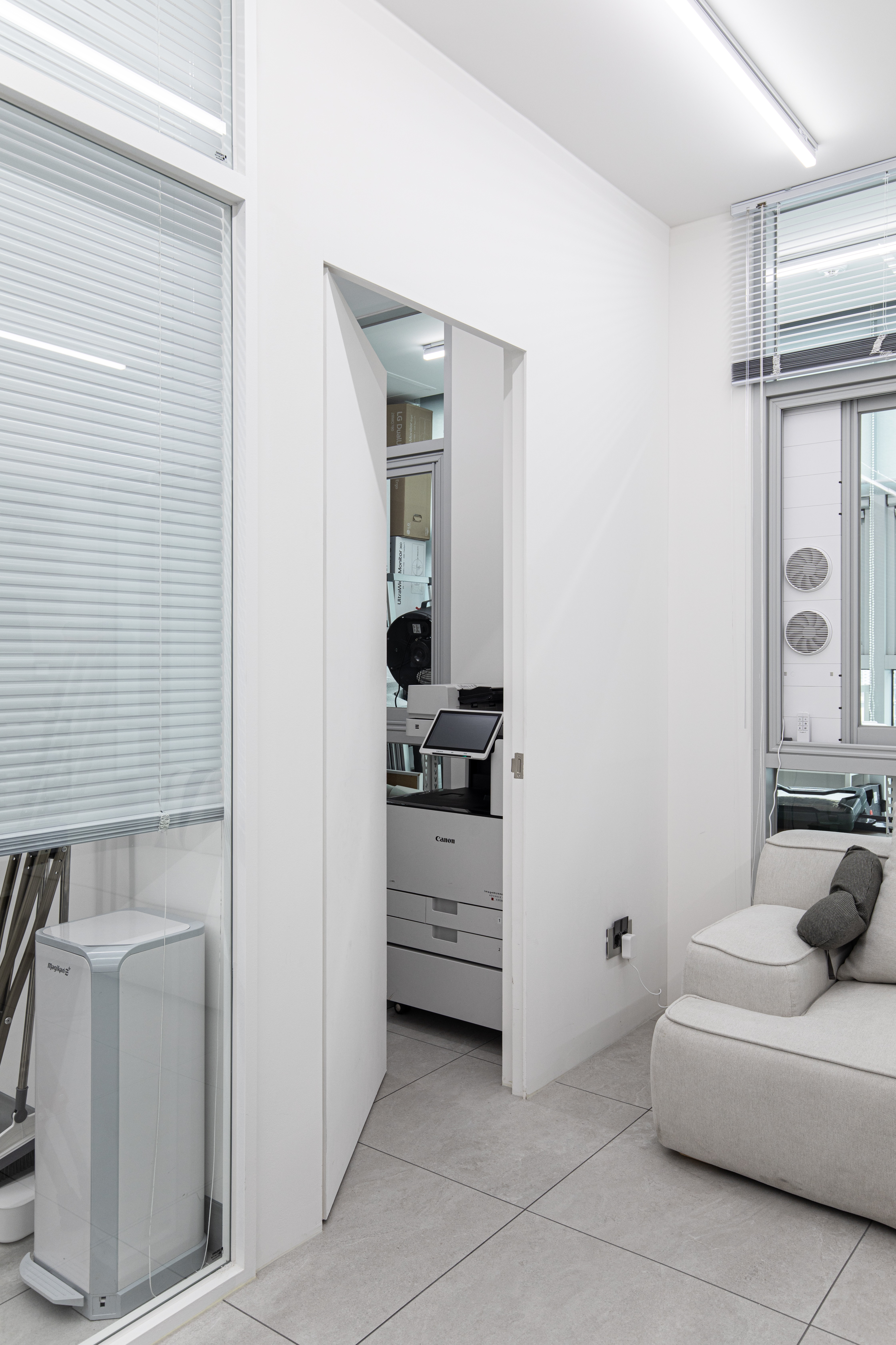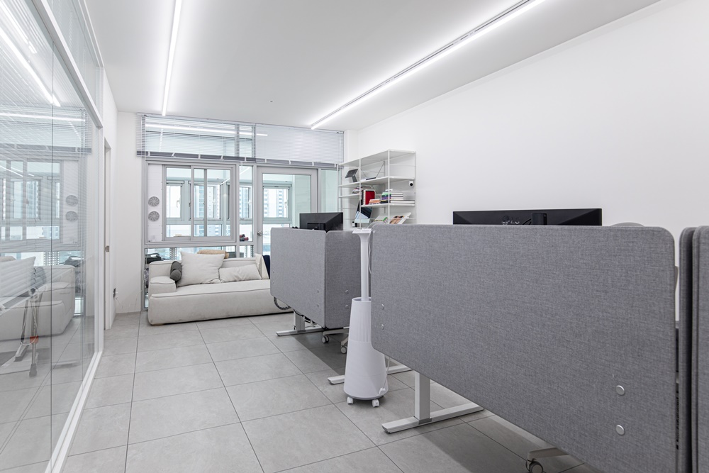 이 사무 공간은 깔끔한 라이트 그레이 타일 바닥과 흰 벽면으로 시각적 안정감과 청결함을 더했고 천장에 설치된 선형 LED 조명은 밝고 균일한 빛으로 집중력을 지원합니다.