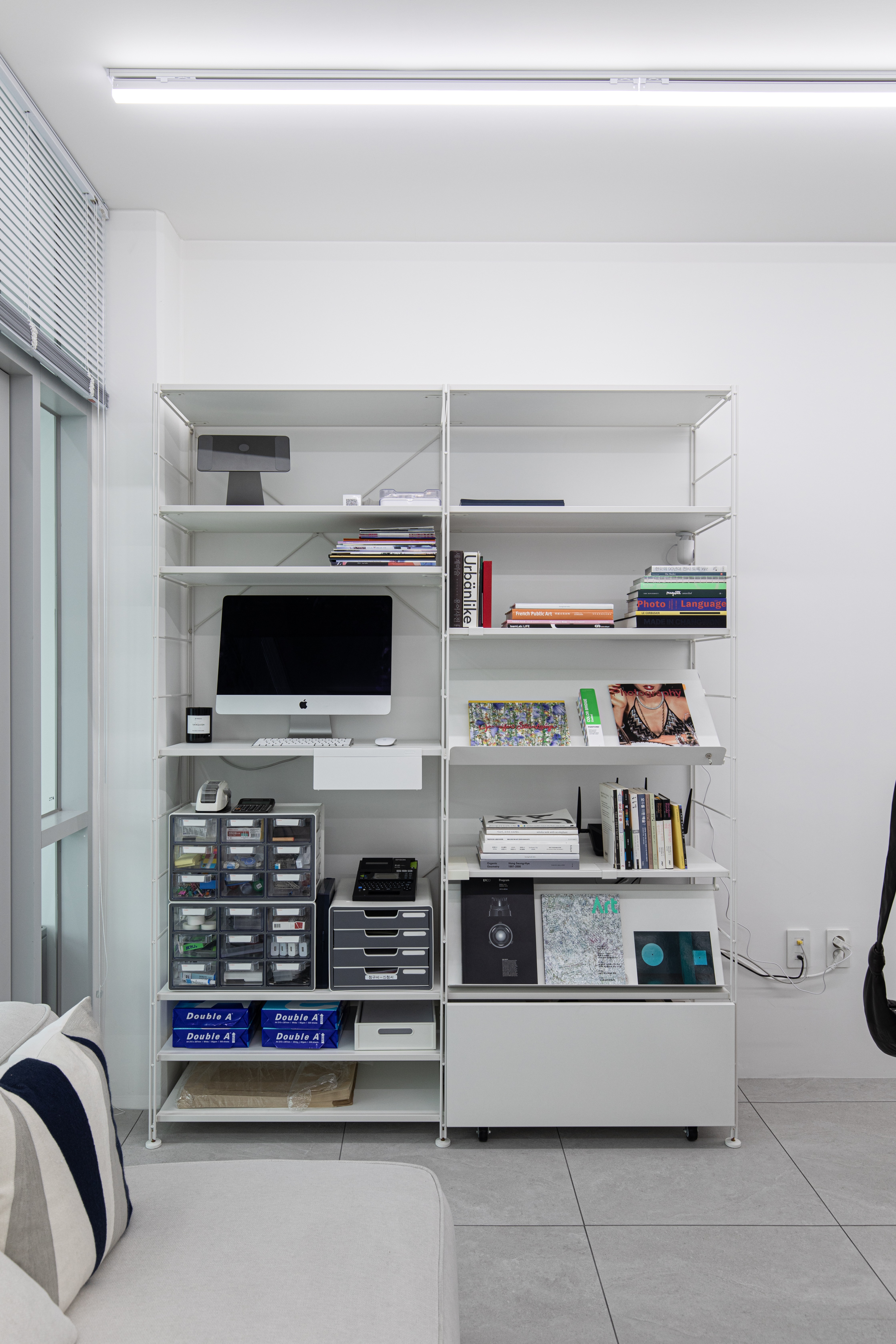 인체공학적 책상과 의자를 배치해 편안한 착석감을 제공하고 금속 소재 선반으로 자료와 소품을 깔끔하게 정리할 수 있도록 계획했답니다.