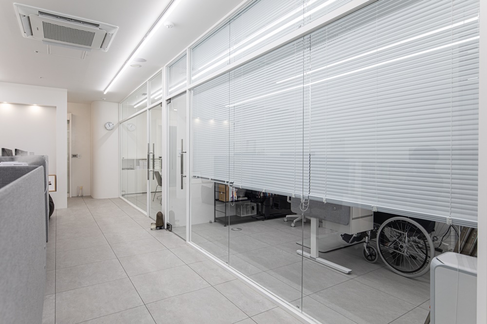 개인 사무 공간은 투명 유리 파티션과 블라인드를 활용해 필요 시 사생활 보호가 가능하도록 설계했어요.