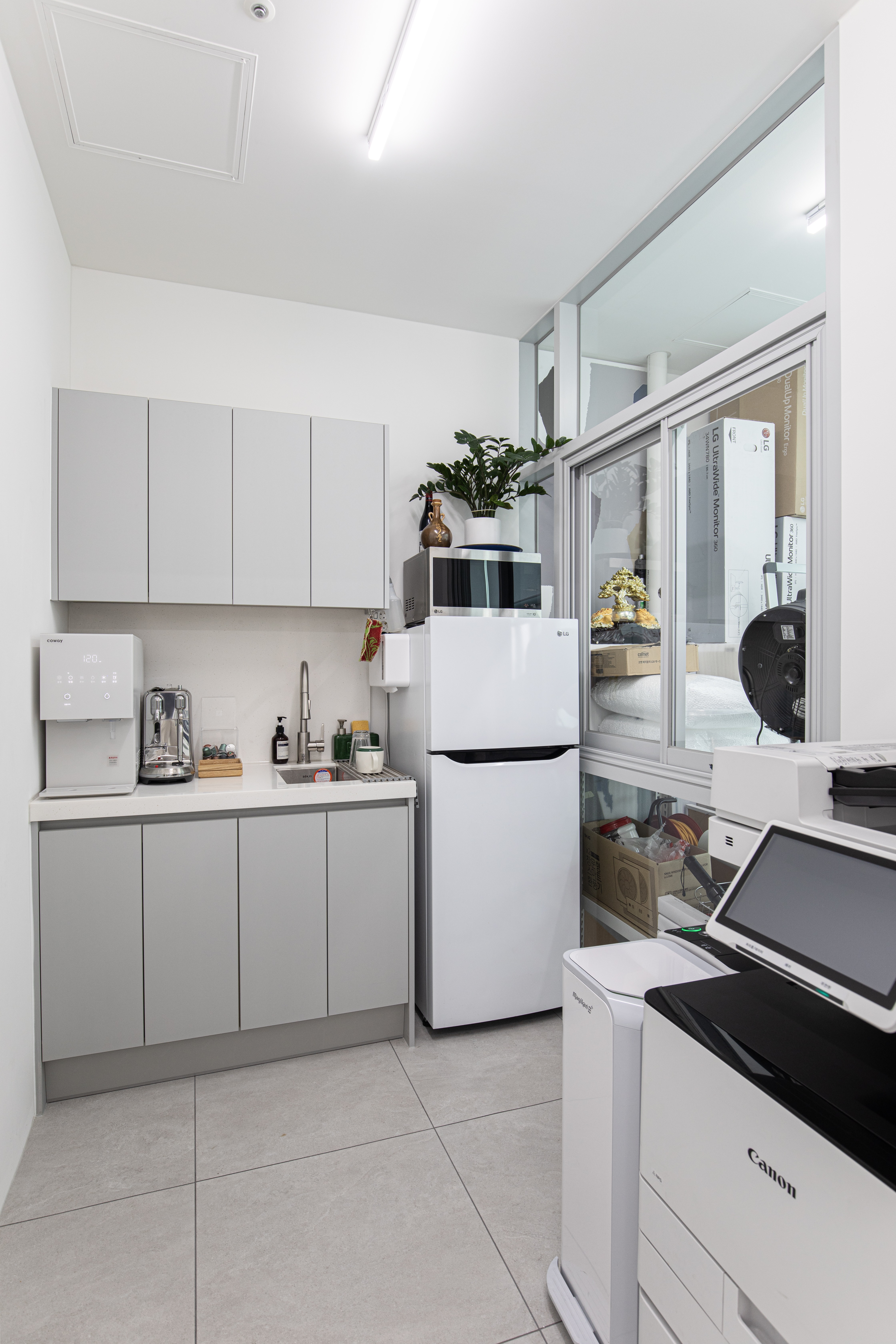 사무실 내 미니 주방 공간은 깔끔한 그레이 톤의 상·하부장으로 구성되어 실용성과 통일감을 높였어요.