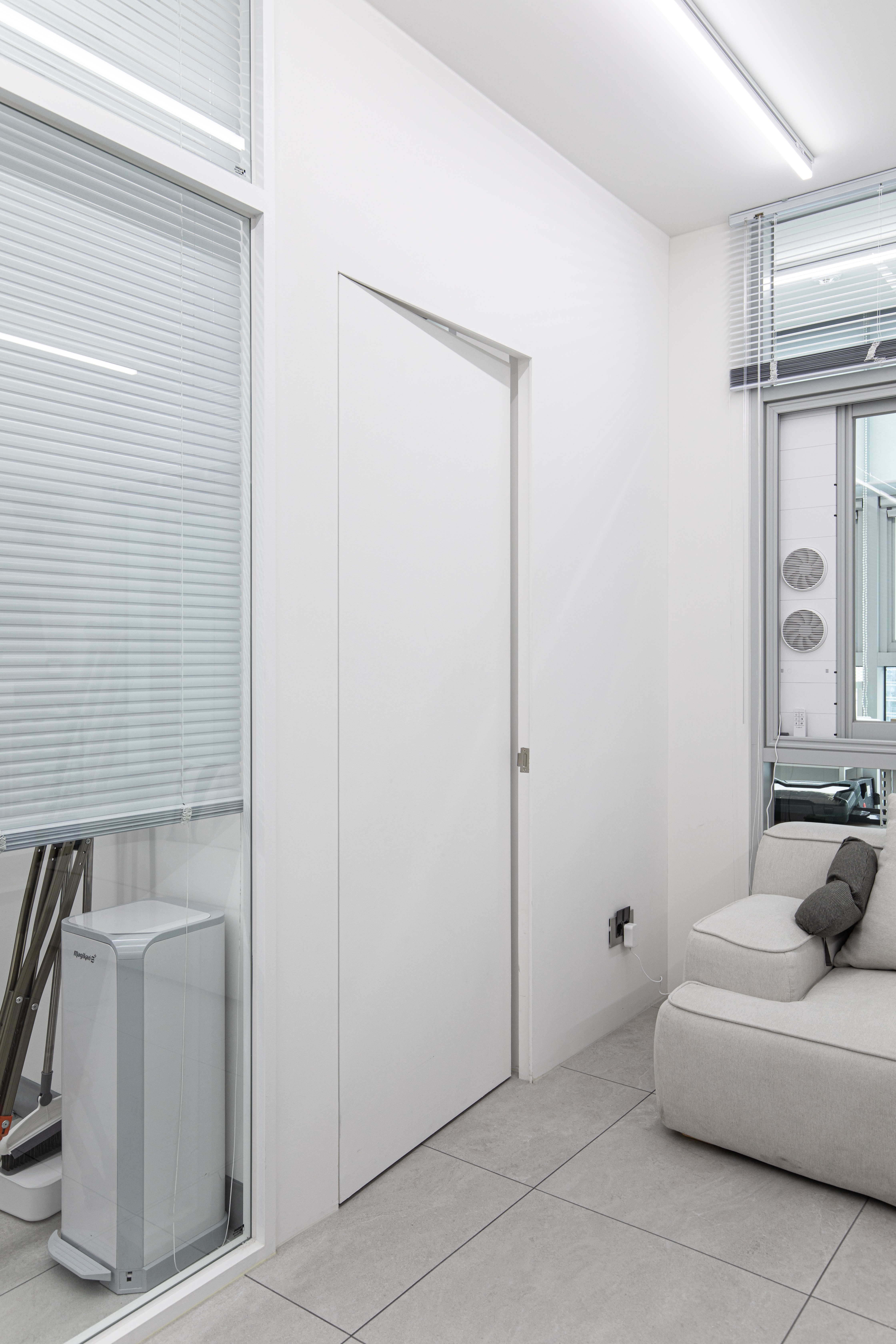입구 복도는 짙은 그레이 컬러 출입문과 깔끔한 화이트 벽, 천장으로 밝고 개방감을 주도록 계획했답니다.