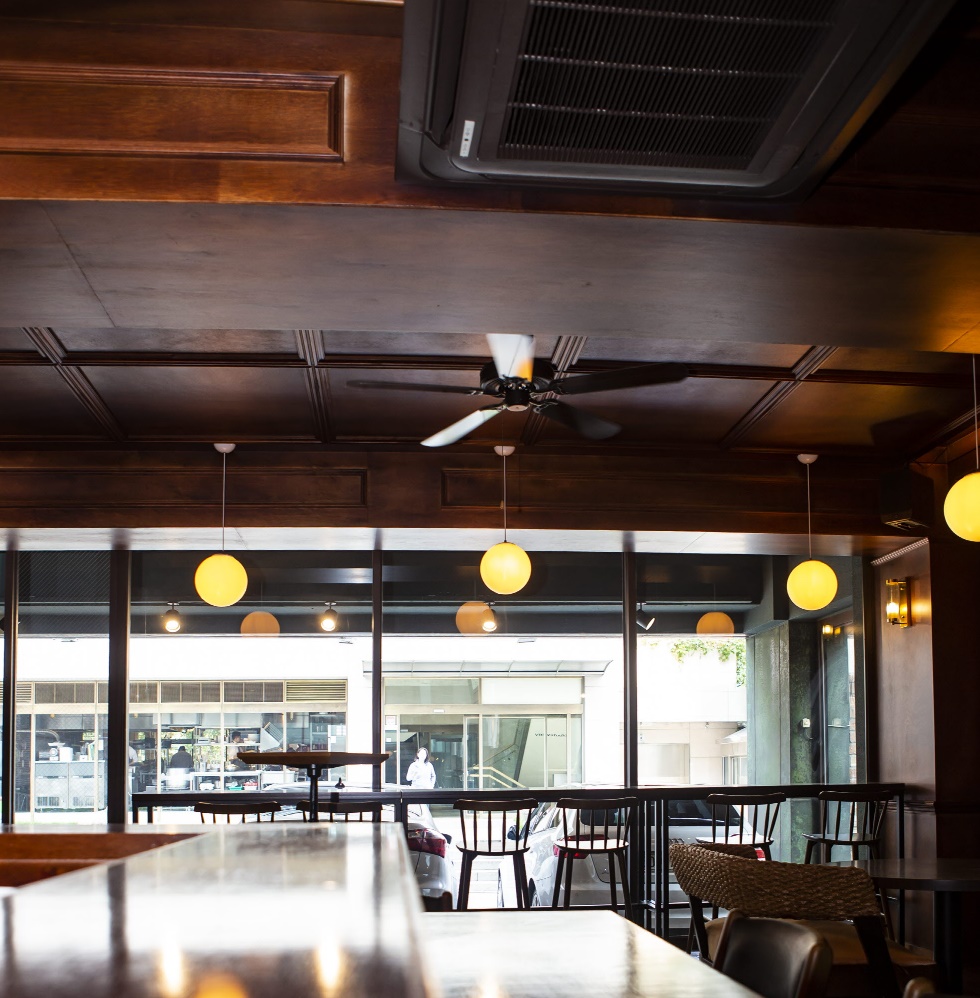 전통적 무드에 어울리는 벤치 구조와 현대미를 살릴 수 있는 다양한 테이블 배열을 조합해 2인·4인 테이블뿐 아니라 긴 바 테이블까지 배치했어요.