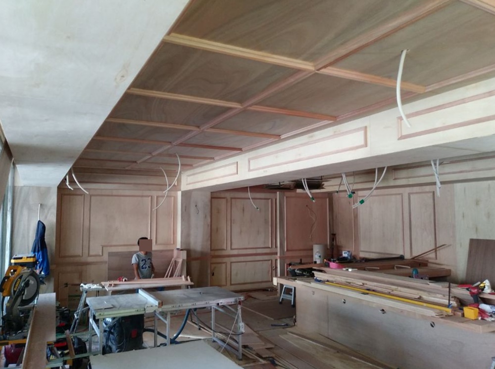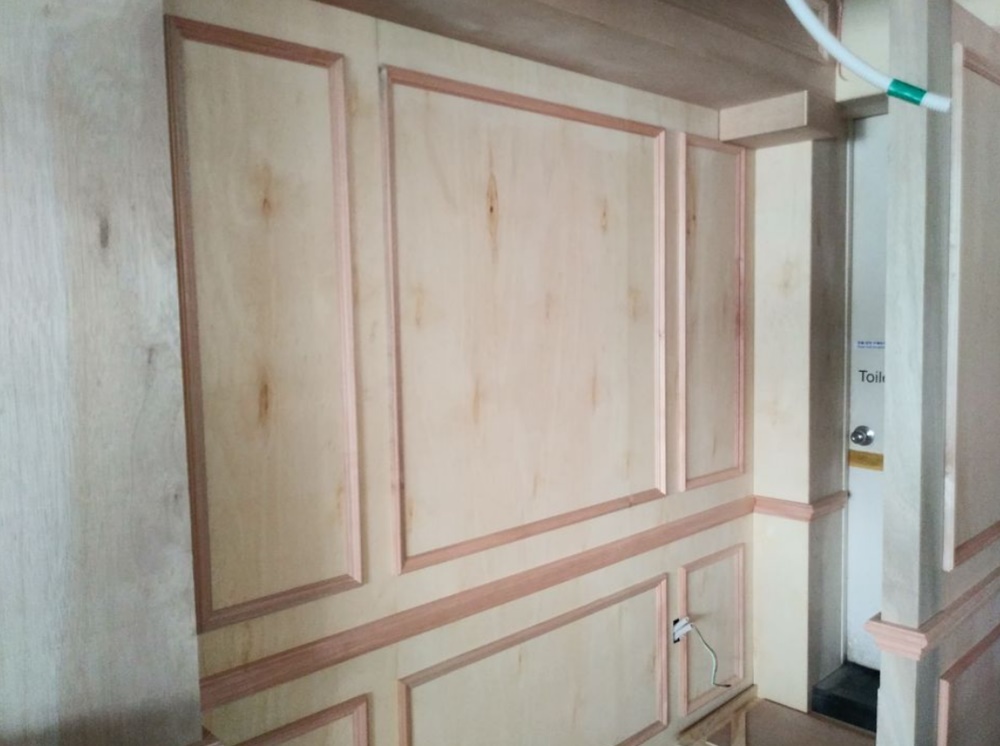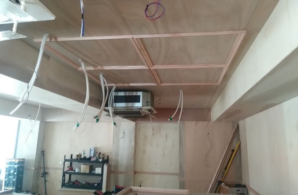 먼저 전체적인 색감과 재질 방향을 정하기 위해 원목 패널과 벽면 마감재 테스트를 여러 차례 진행했는데요.