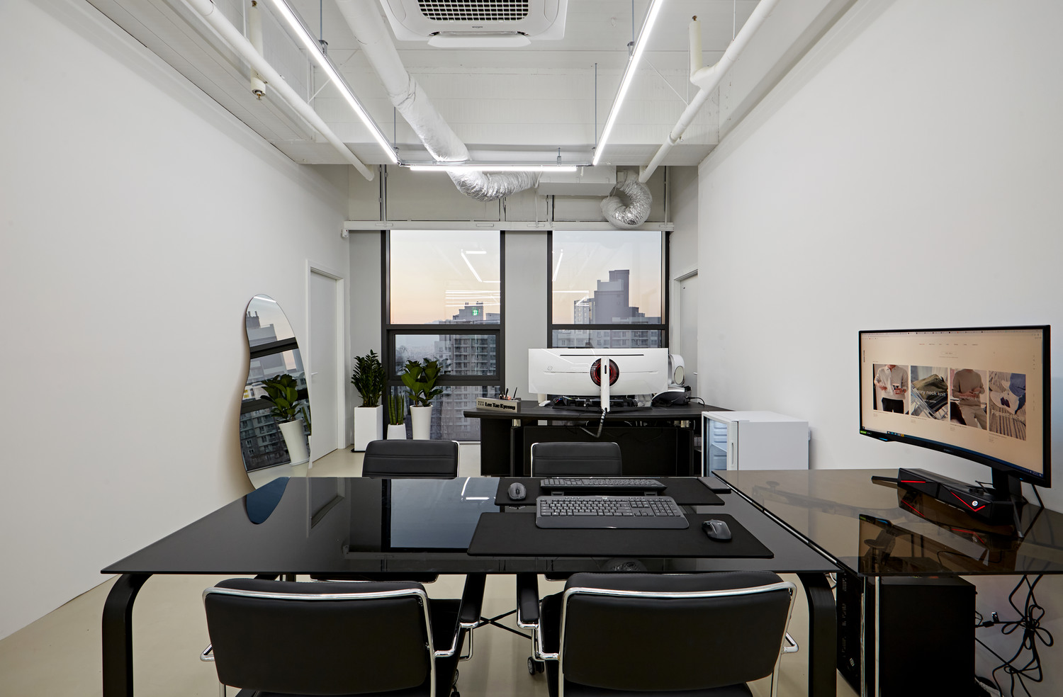 CEO룸에서는 간단한 미팅을 빠르게 이뤄낼 수 있도록 테이블이 마련되어 있으며 대표님의 등 뒤로 통창을 시공하였습니다. 저녁 노을지는 모습을 볼 수 있는 시티뷰가 매우 인상적이고 개방감을 높여주는 디자인이라고 할 수 있는데요.전체적으로 화이트와 블랙 색상만을 사용하여서 심플하면서도 고급스러운 인테리어로 시공하였습니다.