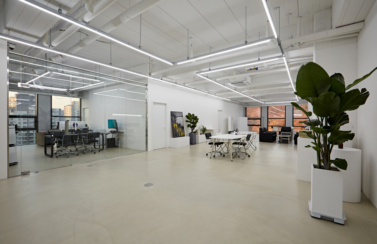 사무공간은 심플하면서도 외부의 야경을 바라볼 수 있고 수평적인 구조에 맞는 미니멀한 컨셉으로 연출했습니다.