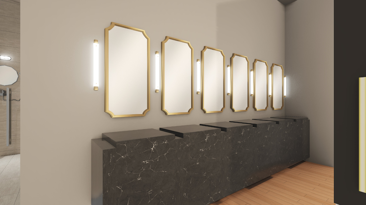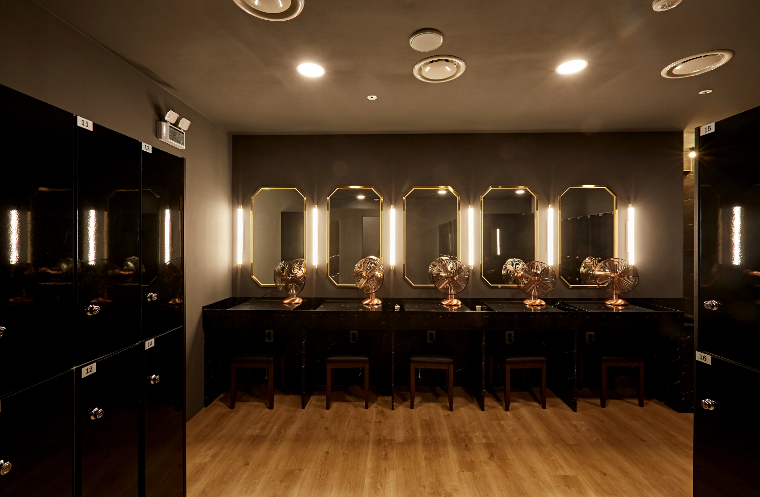 혜화 성신 돈암 헬스장인테리어의 탈의실 및 샤워실은 마치 고급 호텔을 연상하게 하는데요. 블랙 인테리어의 고급스러움에 골드 컬러를 더하였고, 팔각 거울과 대리석 질감의 테이블이 마련되어있습니다.