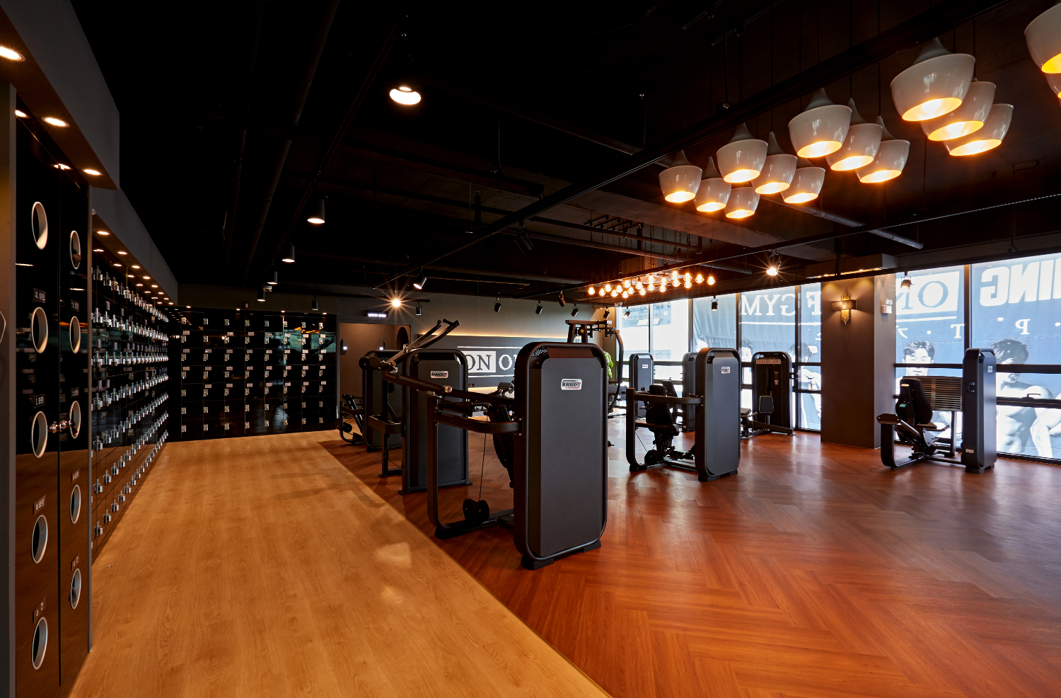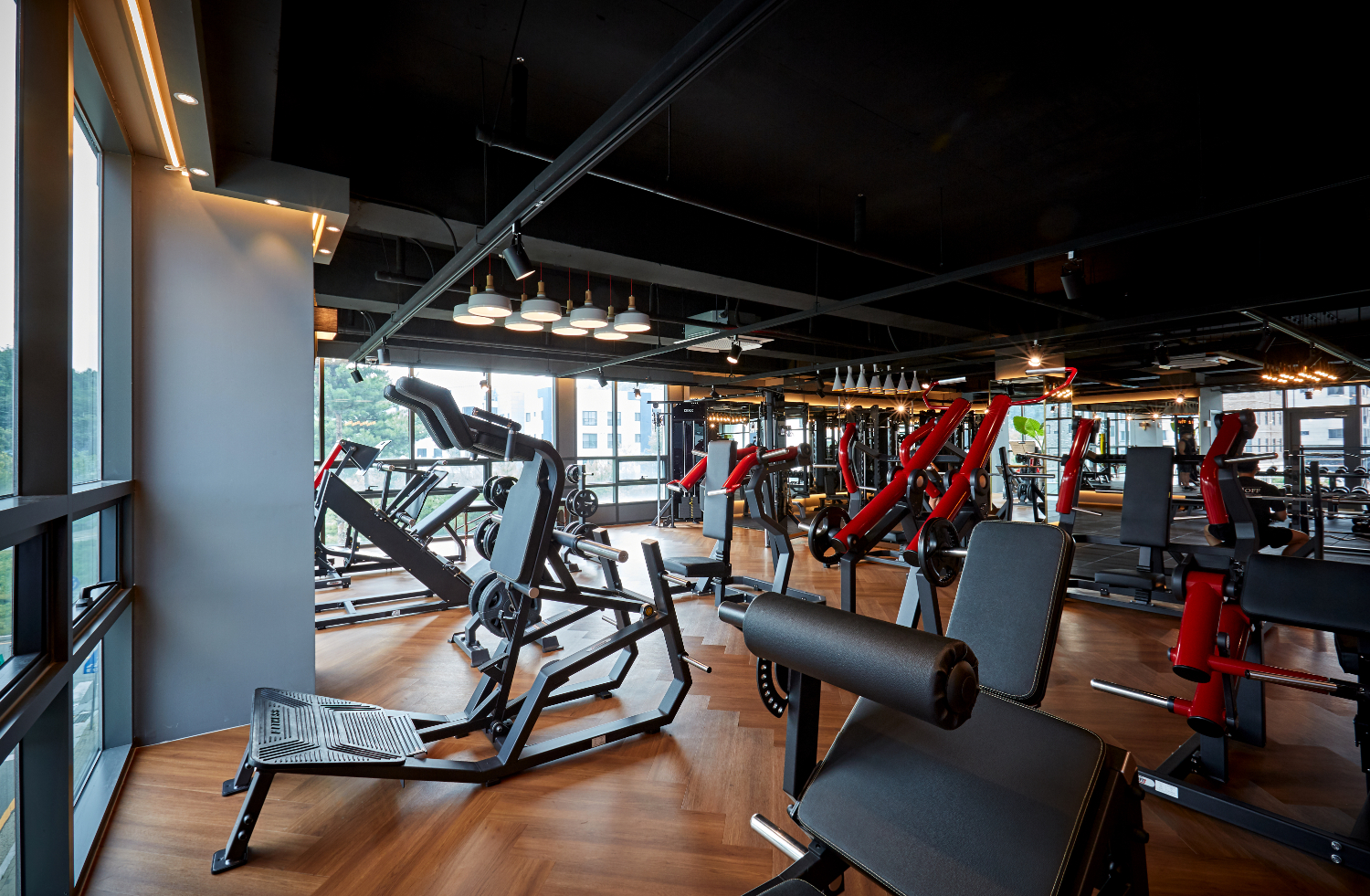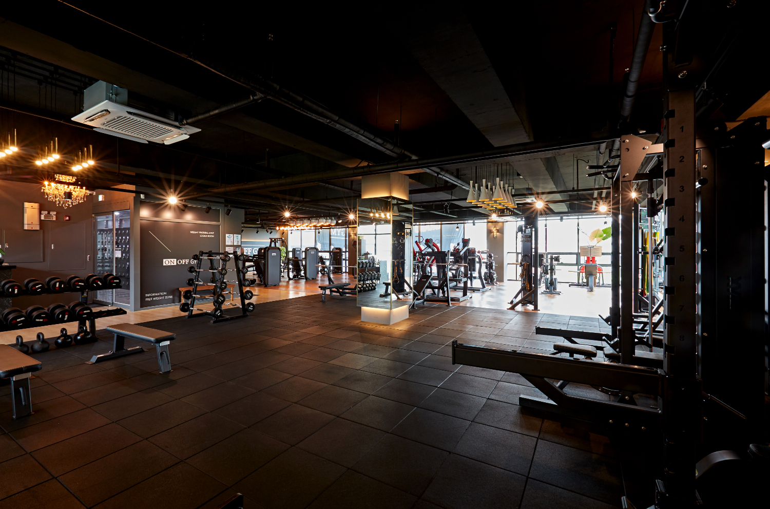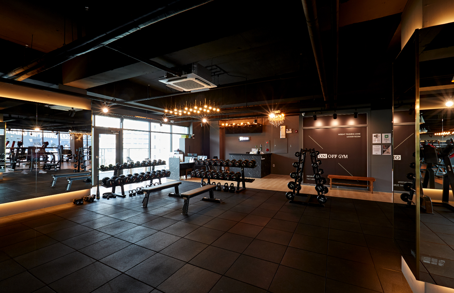 전반적인 분위기가 어둡다고 생각될 수 있으나 곳곳에 간접조명을 설치하여 은은한 분위기를 유지하고, 전체 통창 시공으로 채광을 높였는데요. 그리고 탄성매트를 넓게 시공하여 어디서든 편안히 운동을 즐길 수 있게 하였습니다