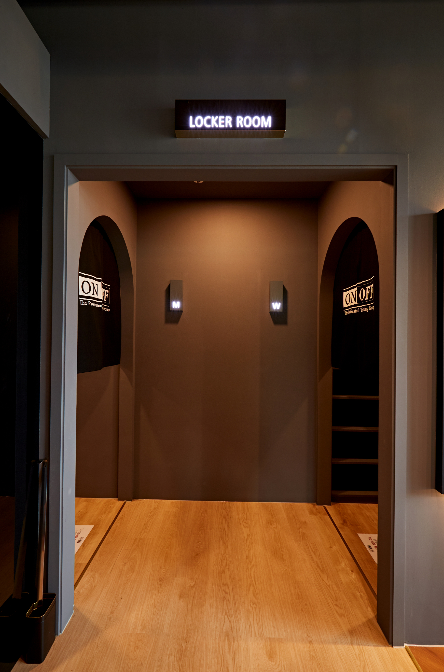 탈의실 입구는 양쪽에 아치형 도어를 시공하여 세련되고 미니멀한 디자인을 가미하였는데요. 또한 코너를 돌아야 탈의실로 들어가니 조금 더 프라이빗한 느낌을 받으실 수 있습니다.