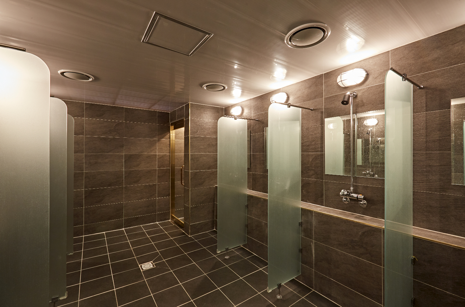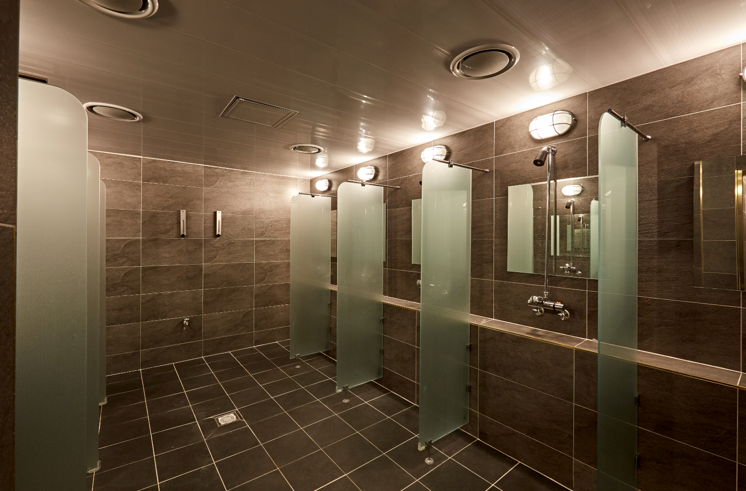 샤워실은 그레이 타일로 청소 및 관리가 용이하게끔 만들어졌으며, 각 수전 사이에 파티션을 설치하여 공간이 분리되는 느낌을 주었습니다. 불특정 다수가 이용하는 곳이기에 더욱 위생적이고 쾌적한 분위기를 만들어야 하기에 많은 신경을 쓴 부분입니다.