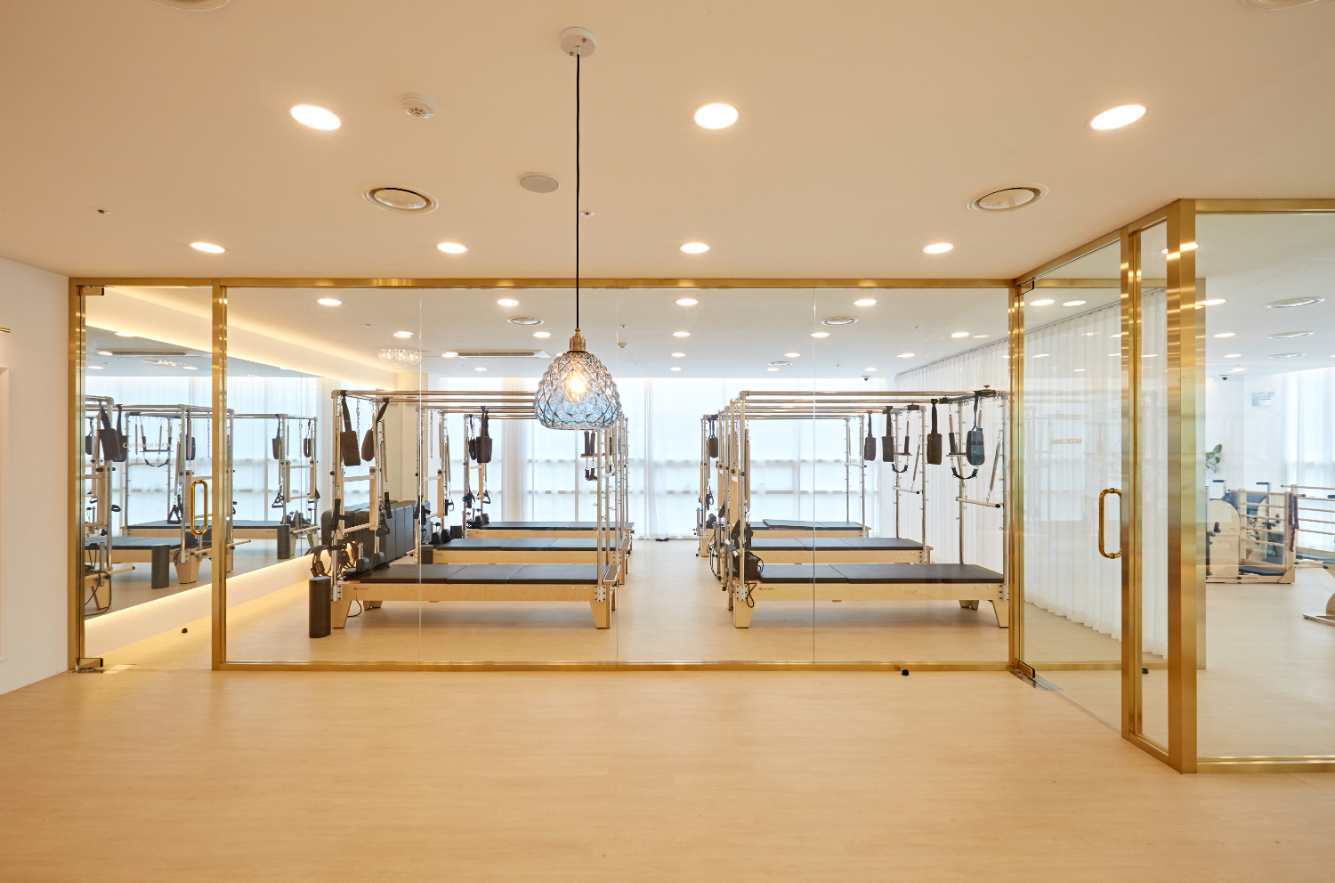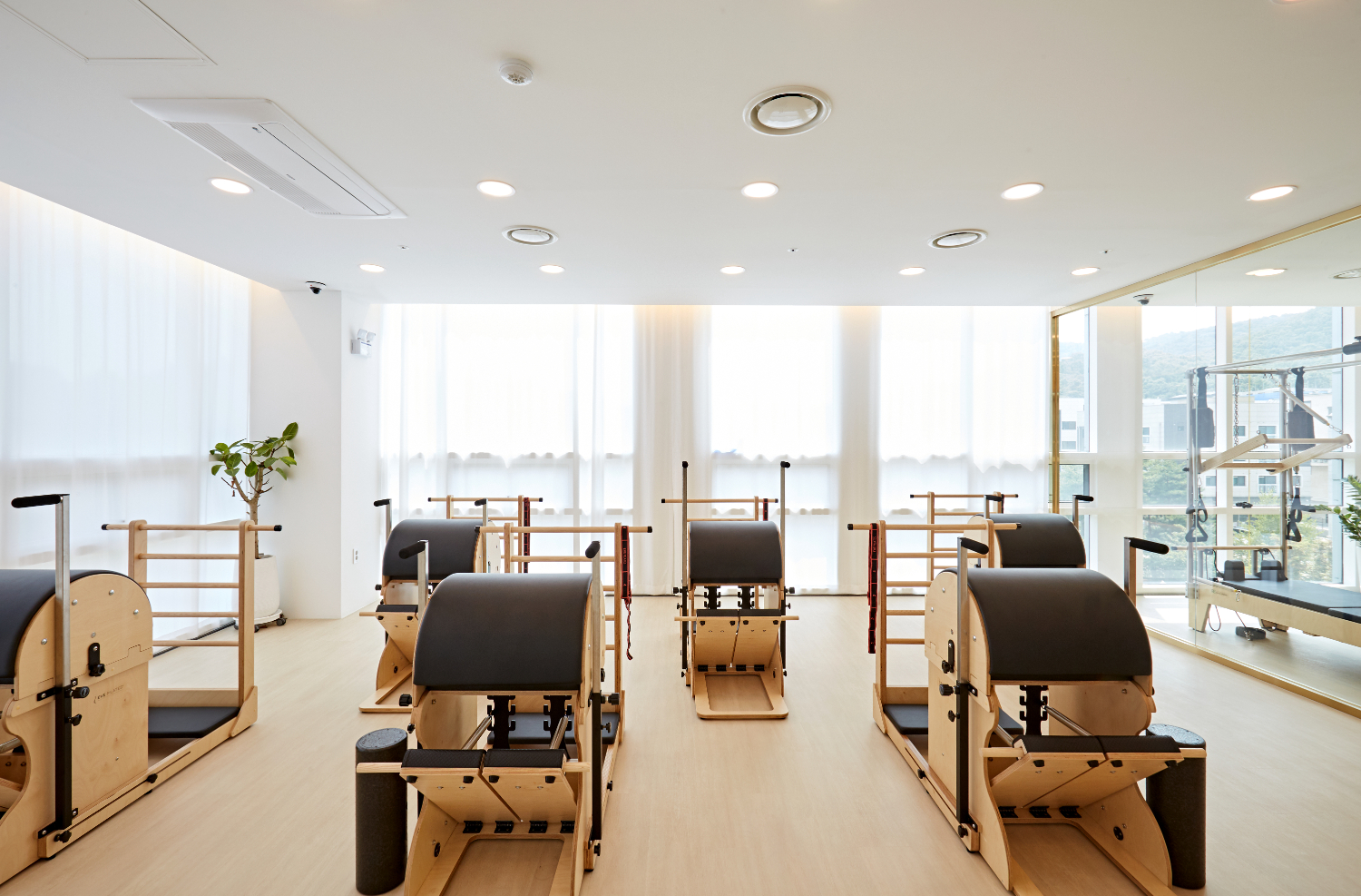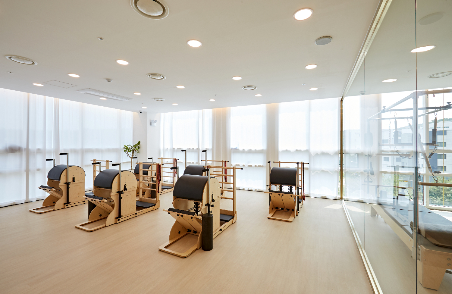필라테스는 보통 기구별로 룸을 다르게 사용하기에, 유리 프레임으로 가벽을 세워 분리하였으며 화사한 느낌을 유지하기 위해 블라인드보다는 커튼으로 외부의 시선을 차단하였습니다. 그리고 천장에는 간접조명이 아닌 규칙적인 LED 조명을 매립하여 화사하게 구성하였는데요.
