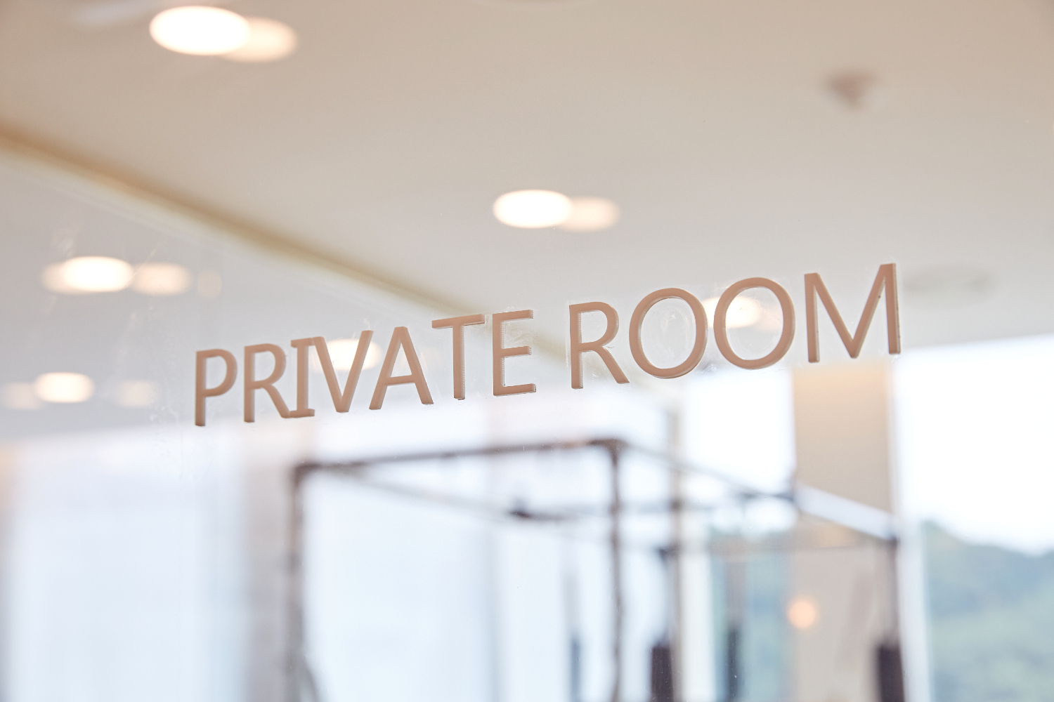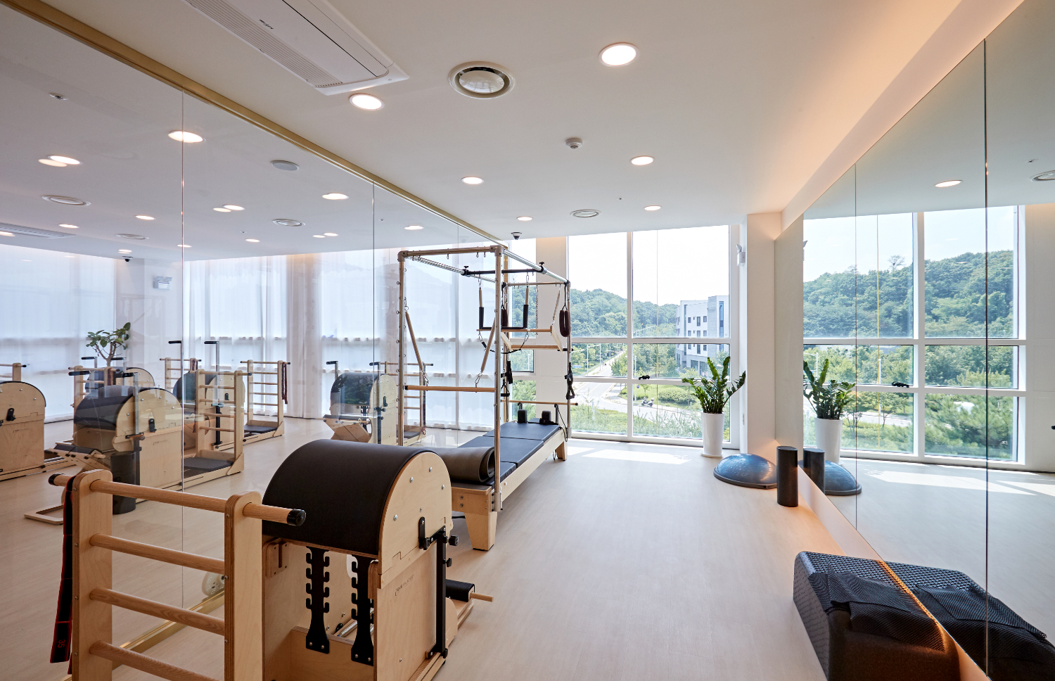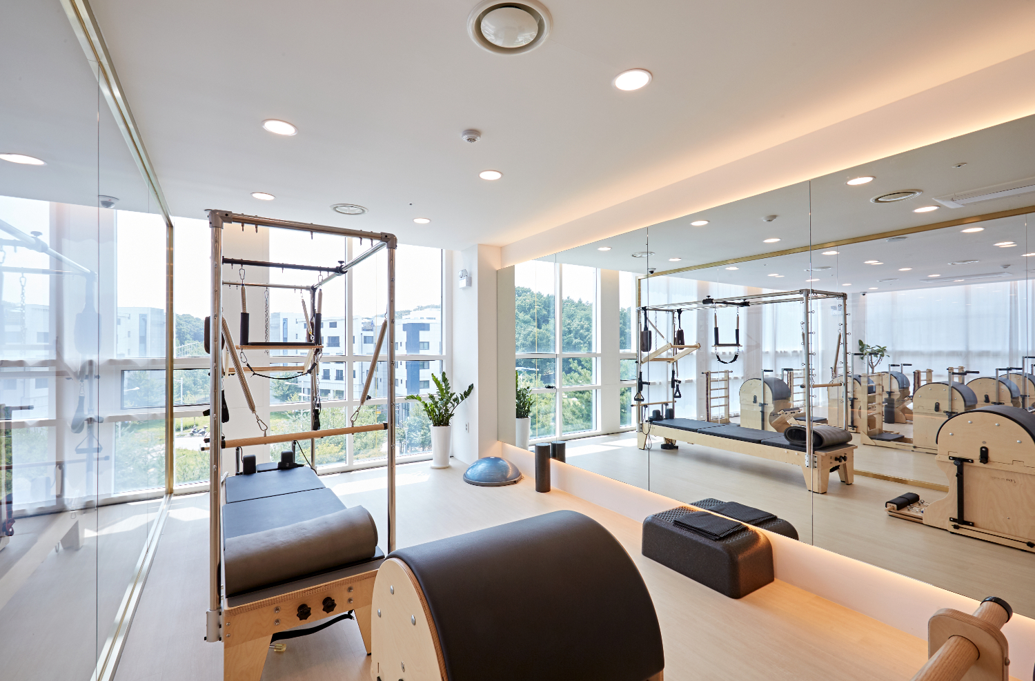 필라테스는 보통 기구별로 룸을 다르게 사용하기에, 유리 프레임으로 가벽을 세워 분리하였으며 화사한 느낌을 유지하기 위해 블라인드보다는 커튼으로 외부의 시선을 차단하였습니다. 그리고 천장에는 간접조명이 아닌 규칙적인 LED 조명을 매립하여 화사하게 구성하였는데요.