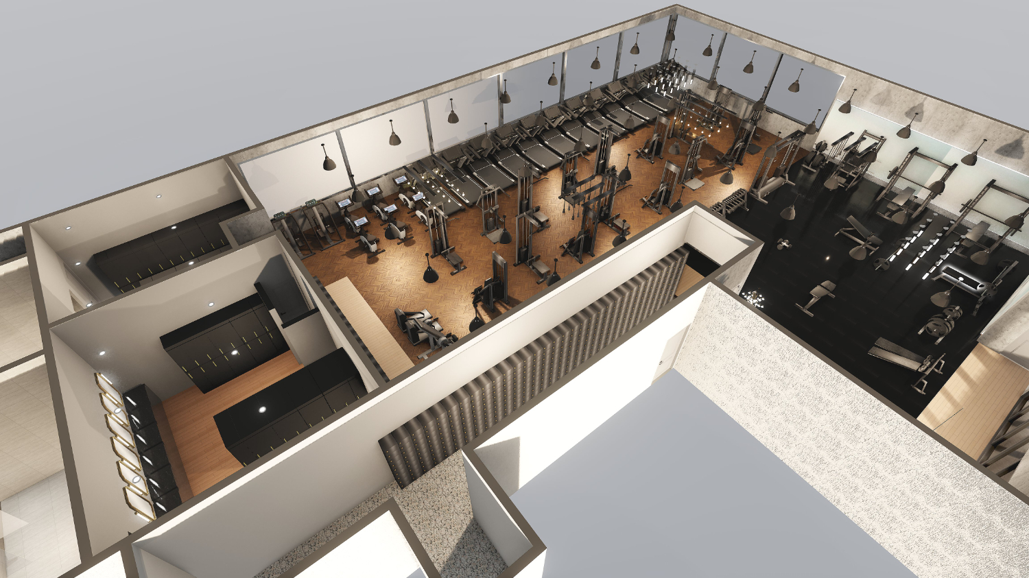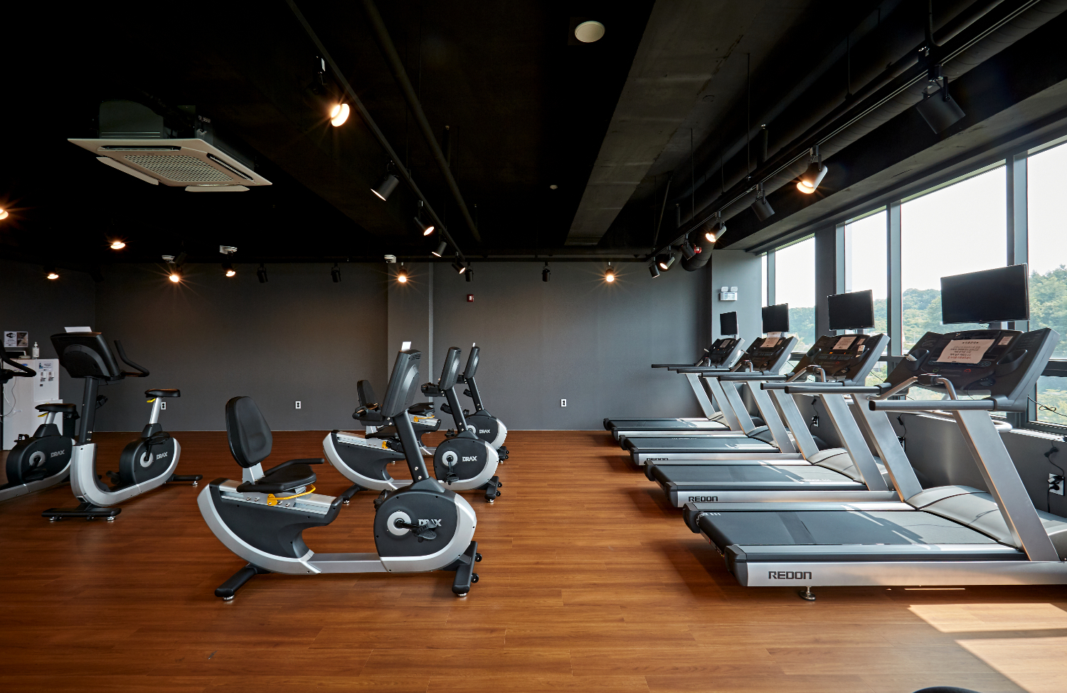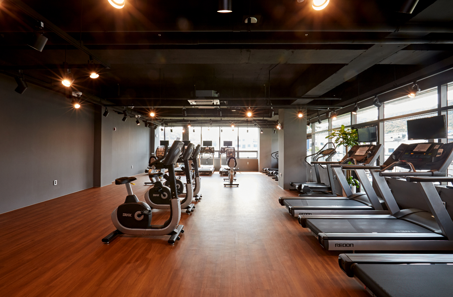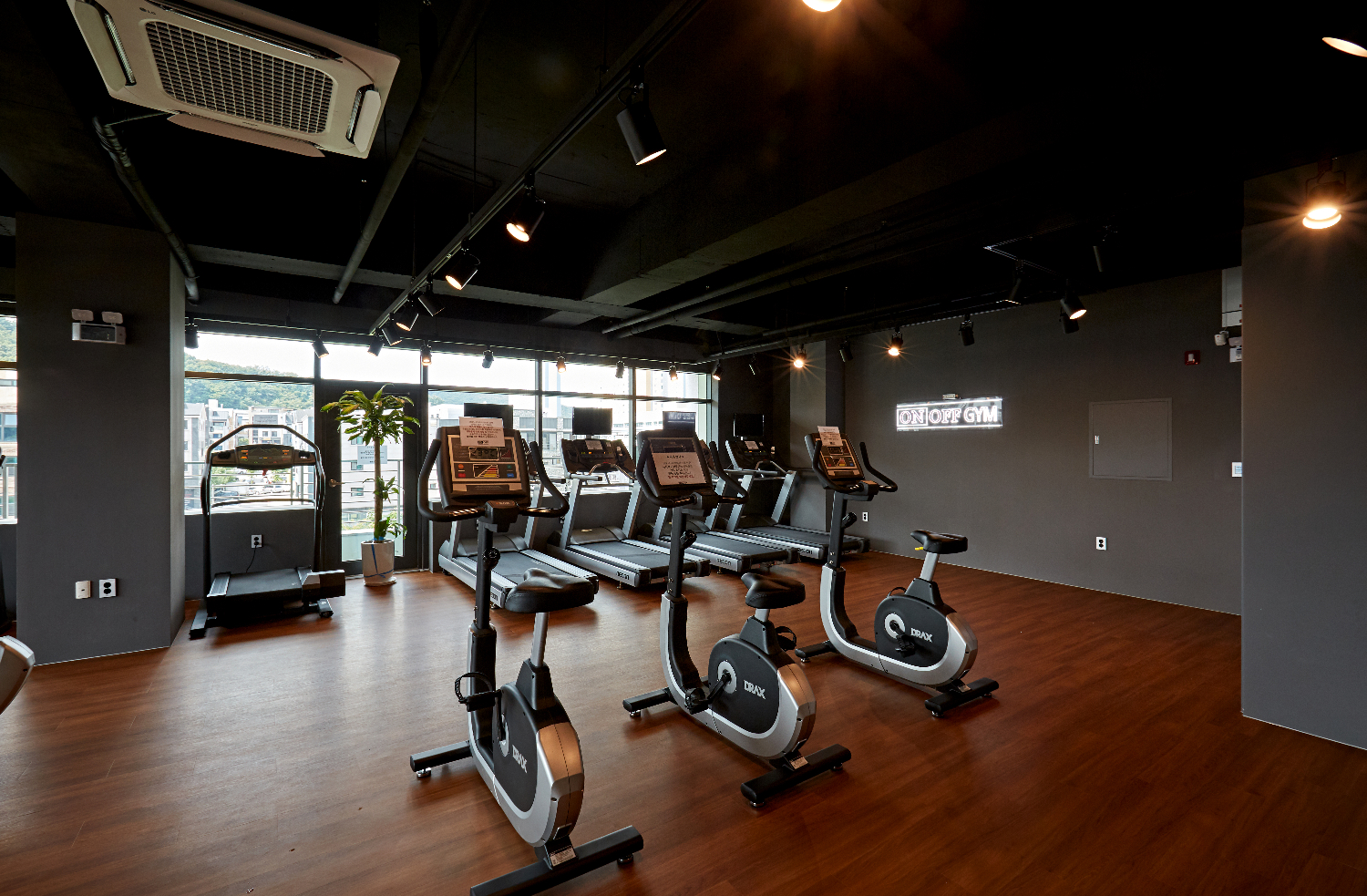 유산소 운동룸은 서로의 간격을 넓게 하여 온전히 자신에게 집중할 수 있도록 만들었습니다. 그리고 천장에는 레일 조명을 설치하여 조금은 더욱 밝은 공간이 될 수 있게 하였고, 벽면 도장도 그레이 톤으로 마감했습니다.
