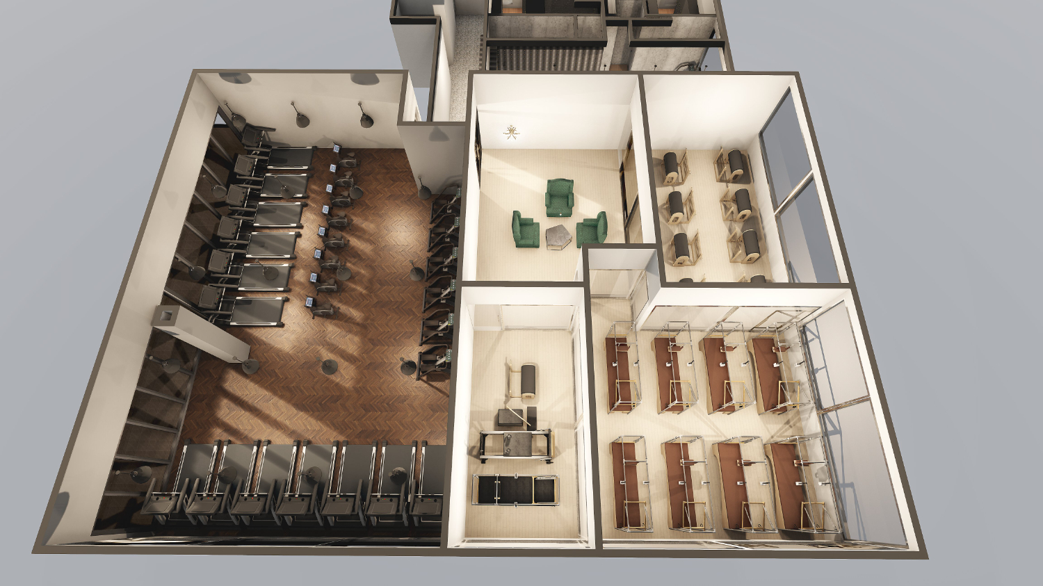 프라이빗룸은 1:1로 수업이 진행되는 곳이기에 여러 기구들을 곳곳에 배치하였고, 전면 유리로 시공하여 자신의 모습을 바라볼 수 있게 만들어졌는데요. 맨 끝쪽에 위치하고 다른 공간들이 일렬로 배열되어 있기에 더욱 확장되어 보이는 느낌을 받을 수 있습니다.