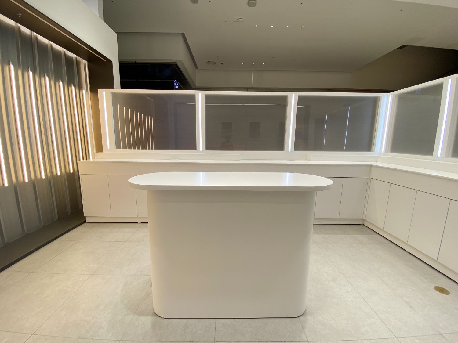 오브젝트 역시 전체적인 인테리어와 분위기에 맞춰 화이트와 레드 컬러로 제작을 했습니다. 가벽 앞으로 배치하여 포이트를 주었고 상단은 시트 작업으로 깔끔하게 마무리한 모습입니다.