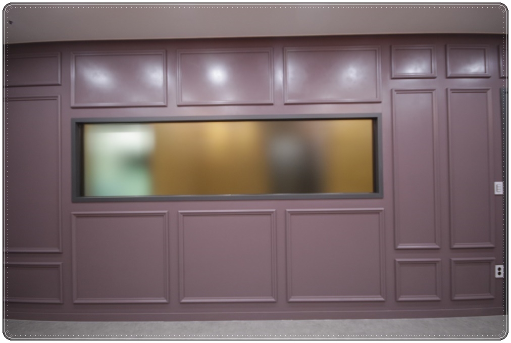 웨인스코팅으로 마감한 인디고 핑크 컬러 벽면이 특색있는 접견실입니다. 외국 바이어가 많이 방문하는 회사의 특성상 접대를 할 수 있는 공간을 요청하셔서 이국적인 분위기로 연출해드렸습니다. 폴딩도어를 시공해 공간을 나눠 사용할 수도 있고 하나로 사용할 수 있도록 해드렸으며 제품을 진열할 수 있는 수납공간과 진열장을 맞춤제작해 드렸습니다.
