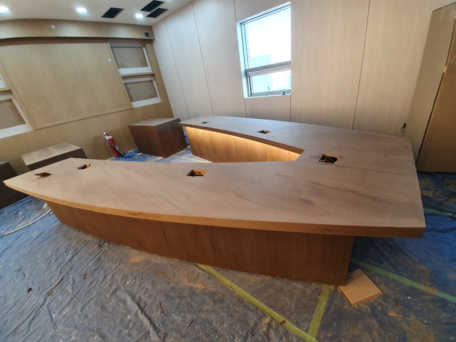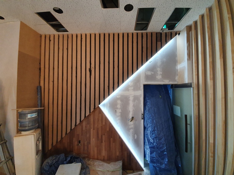 바닥 공사를 마친 후 바닥을 보양하고 바로 목공 작업을 시작했습니다. 이번 현장은 V자형 테이블부터 벽면까지 대부분 목공으로 이뤄질 예정이기 때문에 특히 더 정밀한 기술력과 꼼꼼한 시공력을 겸비한 전문인력과 함께 작업을 했습니다. 사실, V자형 테이블과 조명 프레임의 구현이 이번 현장의 핵심이라 살짝 걱정이 됐는데요, 얼핏 봐도 테이블과 테이블 라인에 맞춘 조명라인까지 완벽하게 시공이 돼서 정말 기뻤는데 고객님도 만족해하셔서 더욱 뿌듯했답니다.