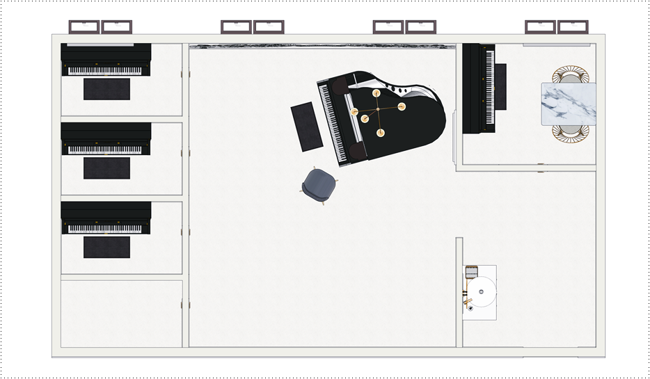 깔끔하면서 고급스러운 외부 익스테리어의 모습은 내부 인테리어에도 적용되고 있습니다. 입구로 들어가면 중앙에는 그랜드피아노가 놓인 홀이 있고 양측으로 측면 연습실이 있습니다. 중앙홀은 학원생들의 연주회가 이뤄질 수 있는 공간이고 오른쪽 측면 연습실은 레슨이 이뤄지는 연습실이며 오른쪽 측면 연습실은 실기 레슨과 이론 수업이 가능한 연습실이면서 상담이 이뤄지는 원장실로 활용될 수 있습니다.