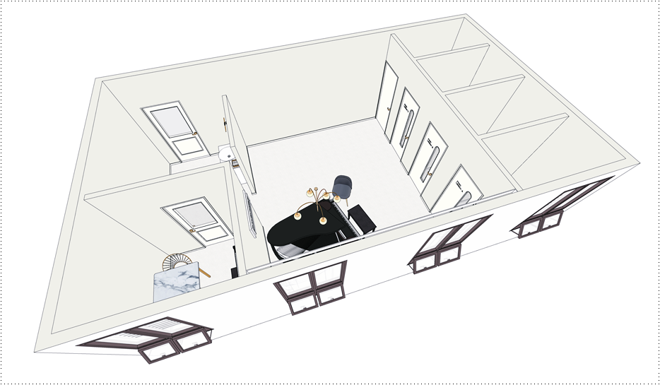 중앙홀을 기준으로 왼쪽에는 3개의 연습실과 하나의 실이 있습니다. 연습실은 피아노의 이동이 가능한 사이즈의 출입문을 계획하고 방음을 충분히 넣어 연주홀 인접한 공간과 간섭되지 않도록 했습니다. 출입문은 레슨에 집중할 수 있도록 목공문을 계획하고 세로로 긴 유리를 디자인해 답답함을 해소하면서 학생의 케어가 가능하도록 배려했습니다.