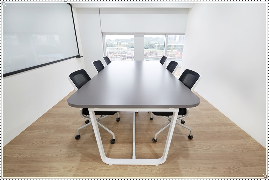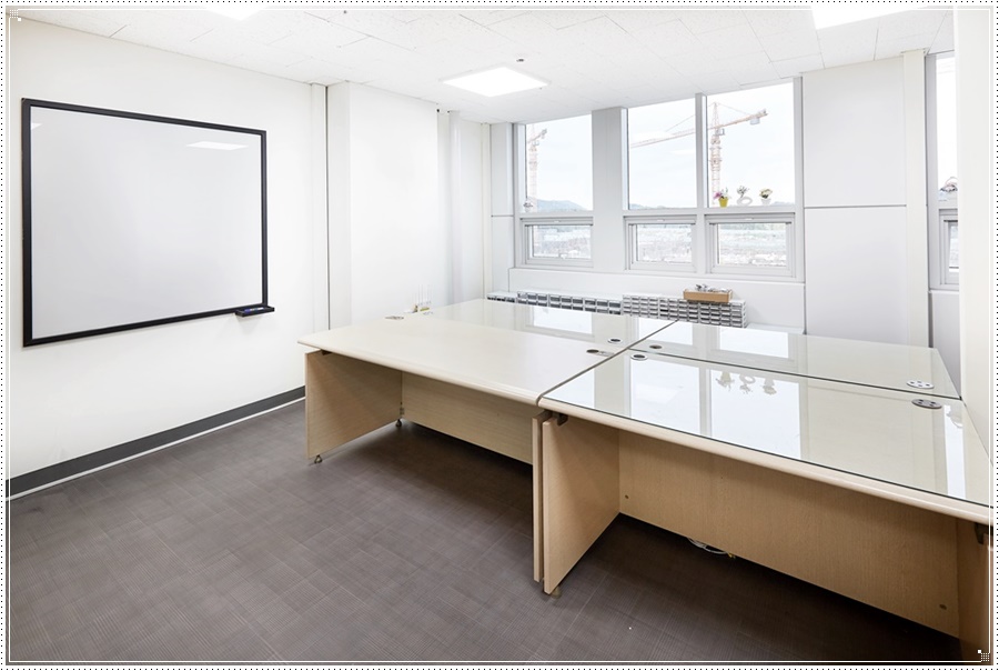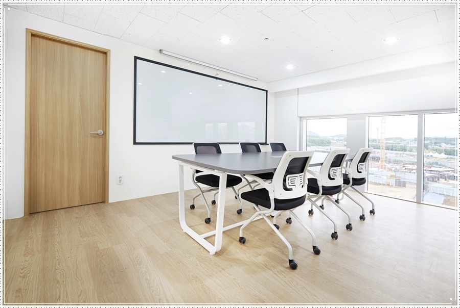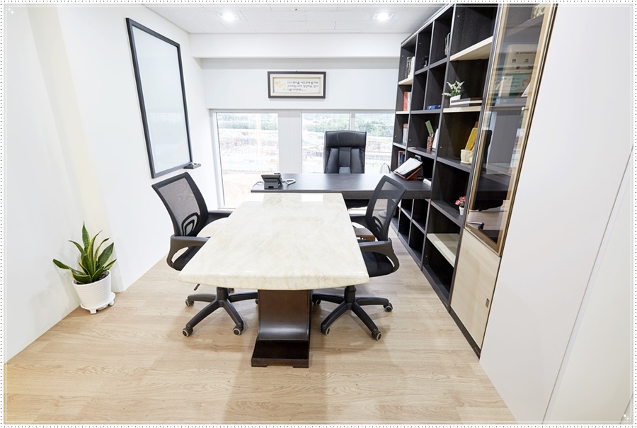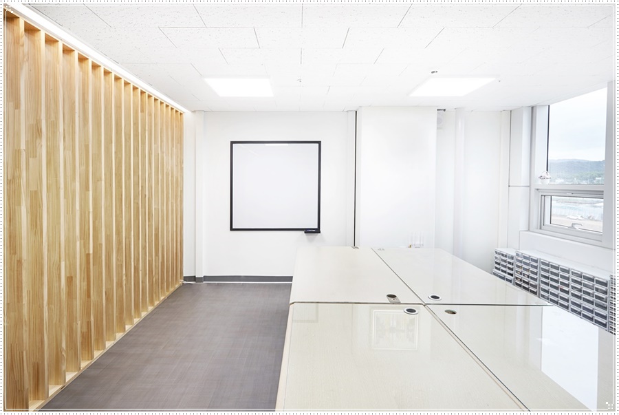 1층 사무실이었다면 엄두도 못냈을 회의실도 만들어 드렸습니다. 역시나 벽과 천창은 화이트온으로 마감하고 바닥, 문, 문틀은 클래식 우드 스타일링을 적용했고 대형 화이트보드를 걸어 자유로운 분위기에서 회의가 진행될 수 있도록 를 완성했습니다.