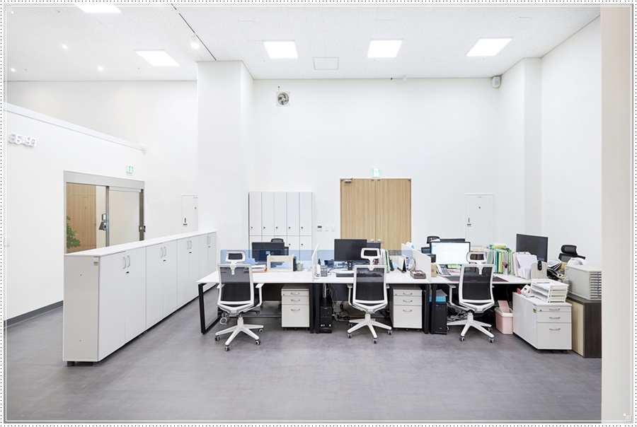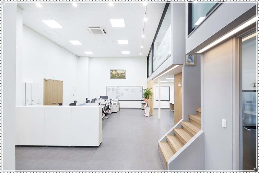 1층 사무실 공간의 모습입니다. 단층이었더라면 한정된 공간 안에서 다양한 활용을 해야 했겠지만 복층으로 시공해 직원들의 사무 공간 외의 공간을 복층과 복층 하단에 구성하니 업무 공간이 좀 더 쾌적하고 능률적으로 바꼈습니다.