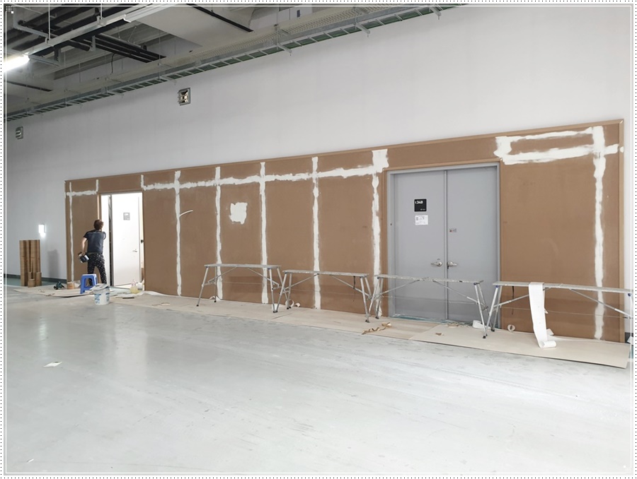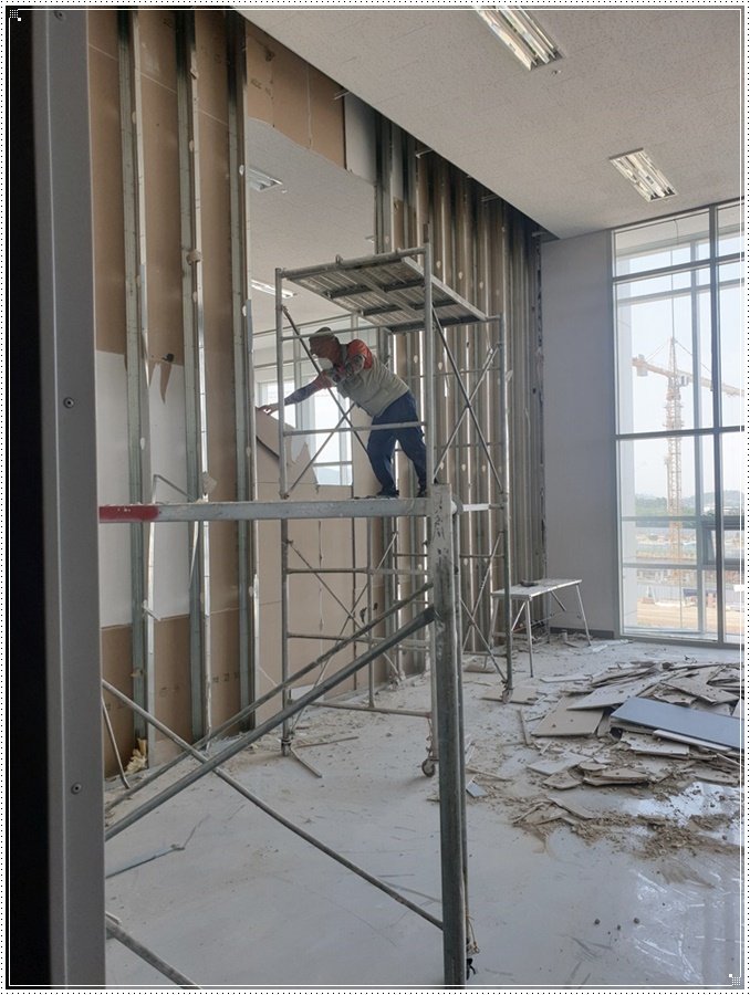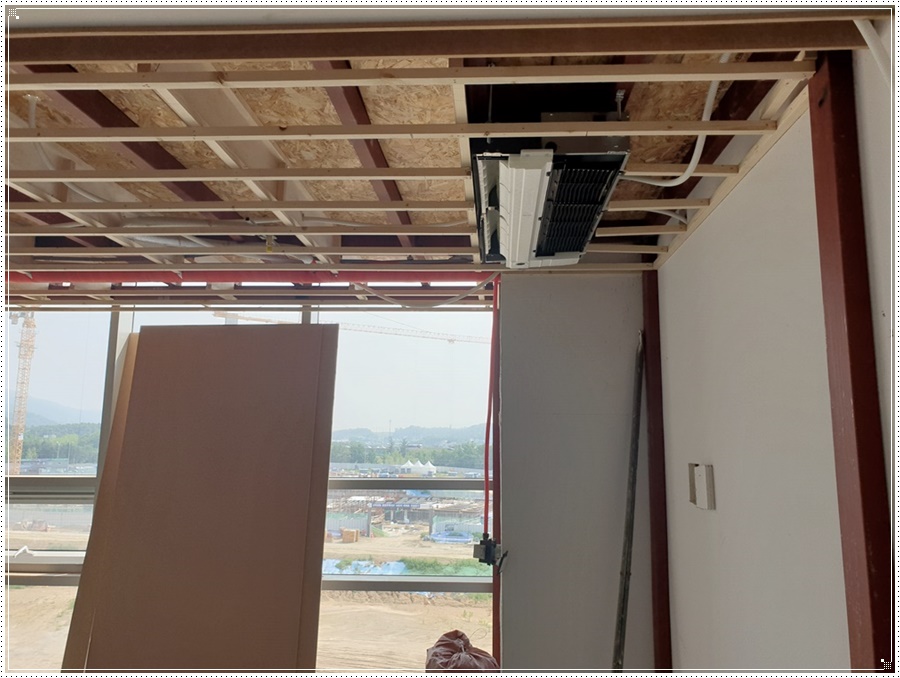 층고가 높게 시공된 사무실이기에 가능한 복층 사무실 공사는 복층이 생겨버림으로써 에어컨 바람이 닿지 않는 복층 아래부분에도 에어컨 설치 등의 공조시스템 작업에도 신경을 써야 합니다. 아직은 한창 공사 중인 모습이긴 하지만 저 문을 열고 들어왔을 때 보일 복층 사무실 모습이 기대되는데요, 입구가 완성된 모습은 마지막에 확인하실 수 있습니다.