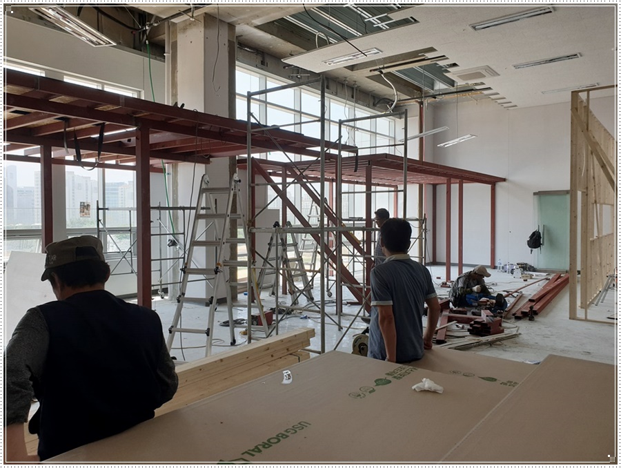 복층을 지지할 파이프 하지작업이 끝나고 아래를 내려다 본 모습입니다. 아직 사무실의 모양이 잡히지는 않았지만 완공된 후 복층에서 내려다 보면 이런 각도로 하층에서 업무를 하고 있는 모습을 한 눈에 볼 수 있겠죠?