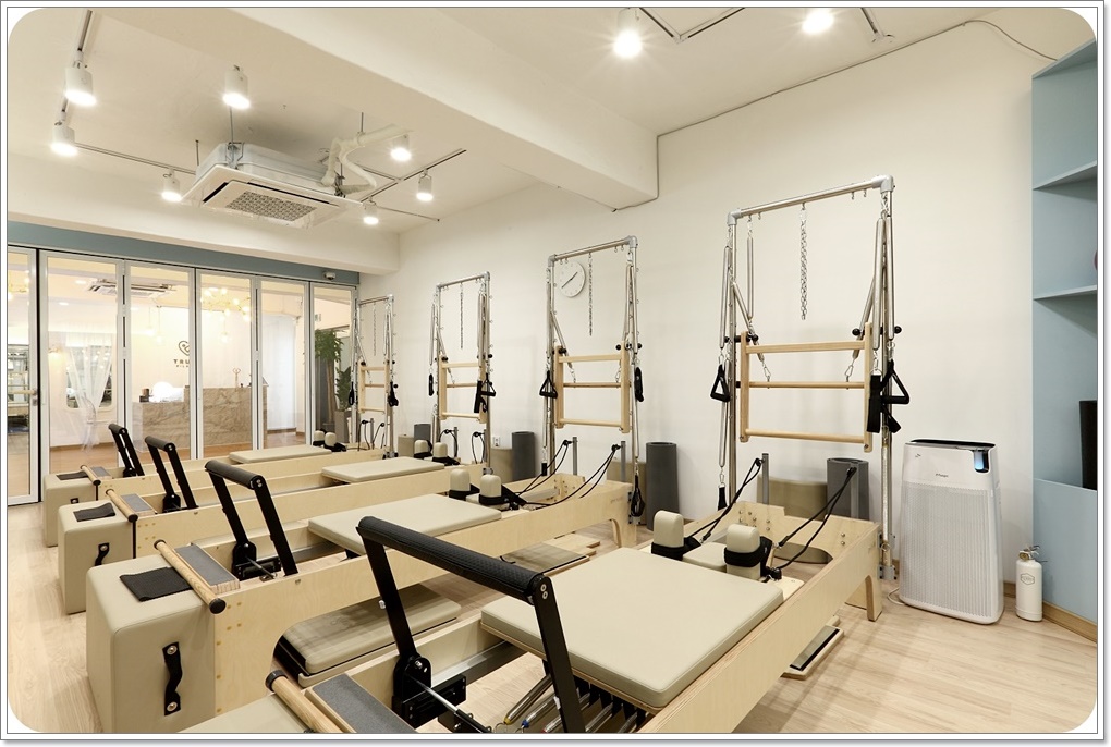 필라테스 샵의 운동 공간의 모습입니다. 다양한 필라테스 기구들이 정갈하고 깔끔하게 구성 배치가 되어있습니다. 저희 916 디자인은 상대적으로 좁아 보일 수 있는 운동 공간의 불필요한 동선을 제거함으로서 가장 효율적인 공간 구성 배치를 해보았습니다. 뿐만 아니라 기구의 퀄리티 또한 매우 높고 필라테스를 운동하는 고객들이 기분 좋게 이용할 수 있게 만들고 있습니다.