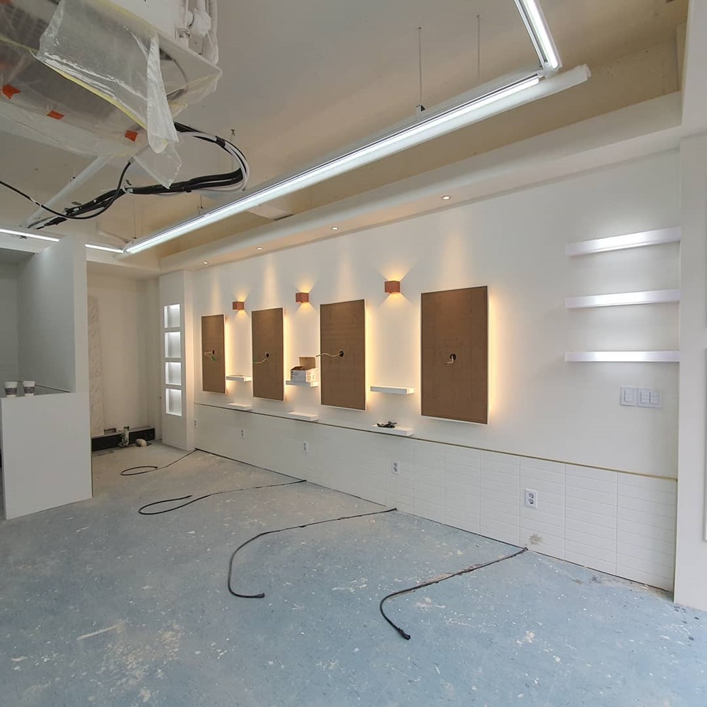 매장 천장에는 레일등을 설치하고 간접등을 설치하여 고급스러운 분위기를 높여 드렸습니다. 그로 인해 화이트 인테리어가 더욱더 퀄리티가 높아졌습니다.
