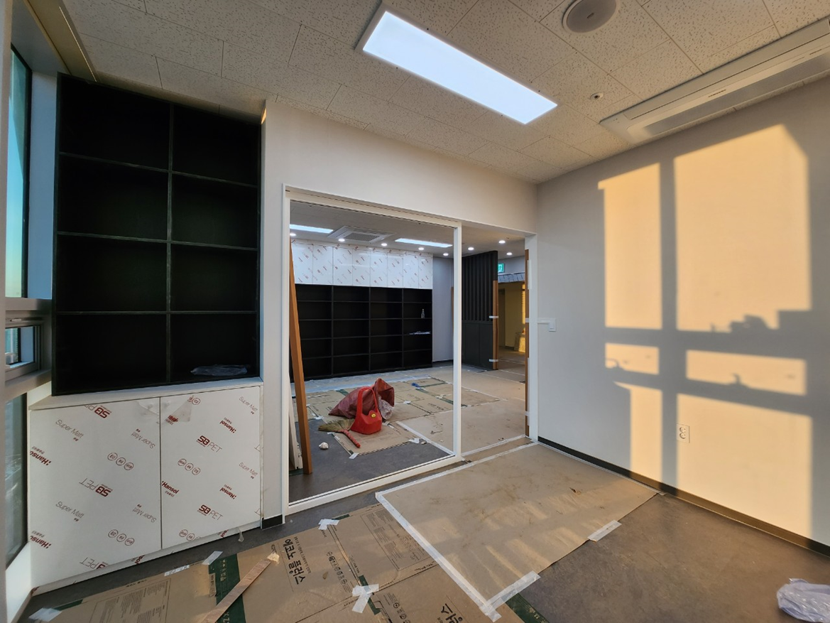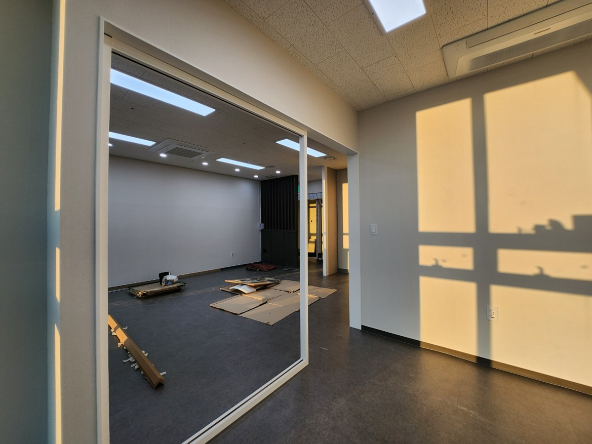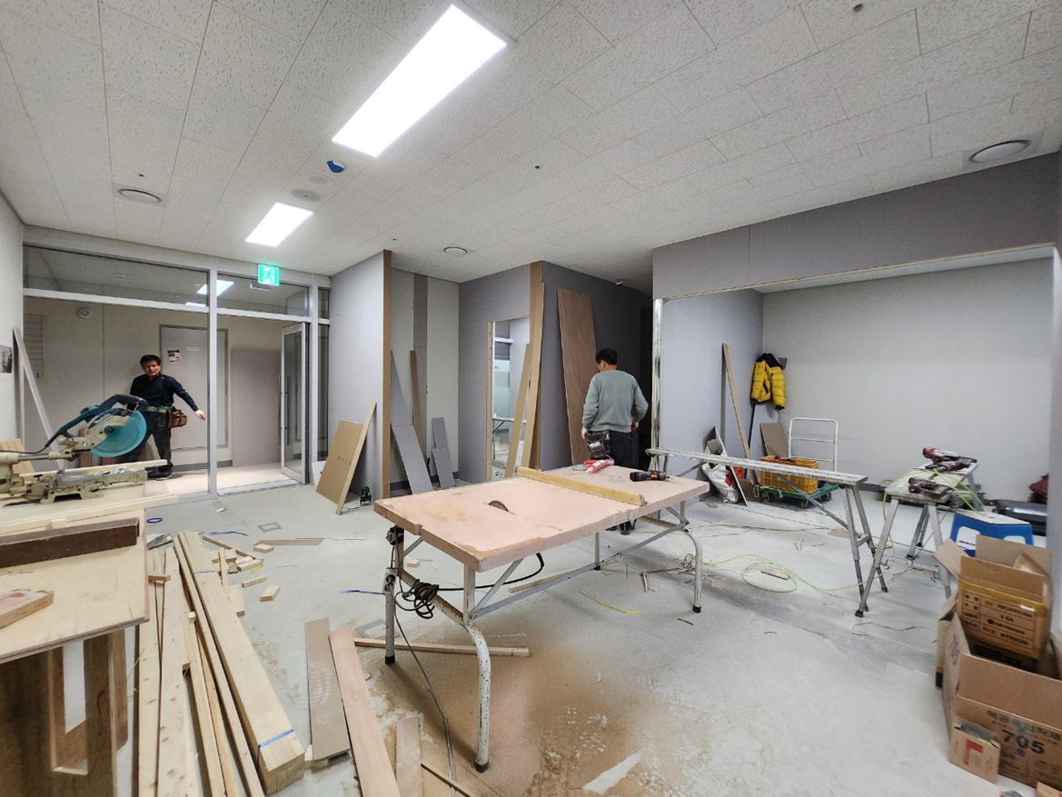 공간 구획을 위해 일부 목공 작업이 진행되었습니다. 특히 고객 상담실과 사무 공간을 분리하는 가벽 설치 등