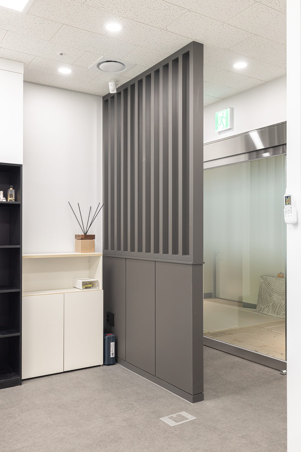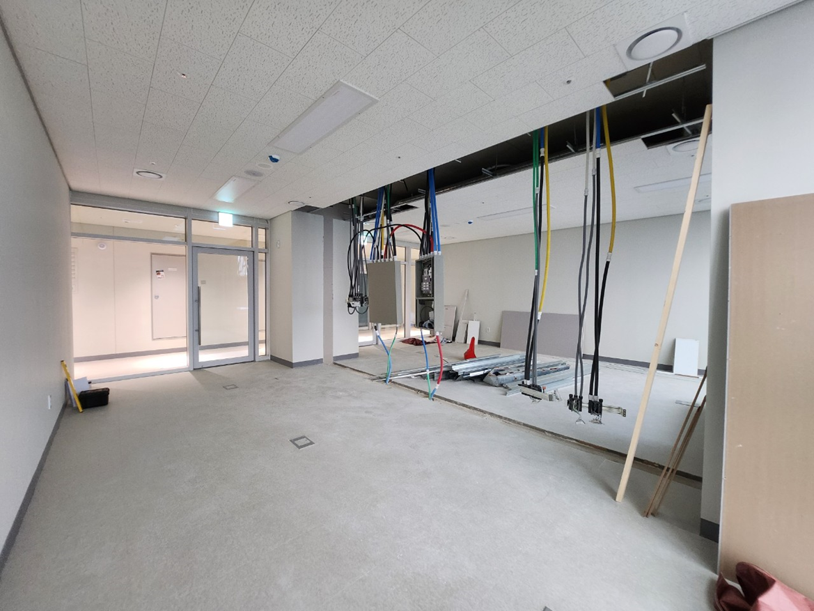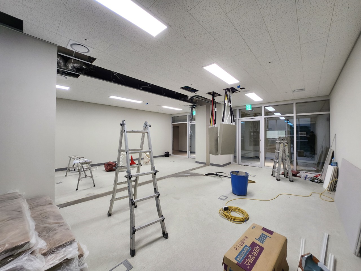 공간 구획을 위해 일부 목공 작업이 진행되었습니다. 특히 고객 상담실과 사무 공간을 분리하는 가벽 설치 등