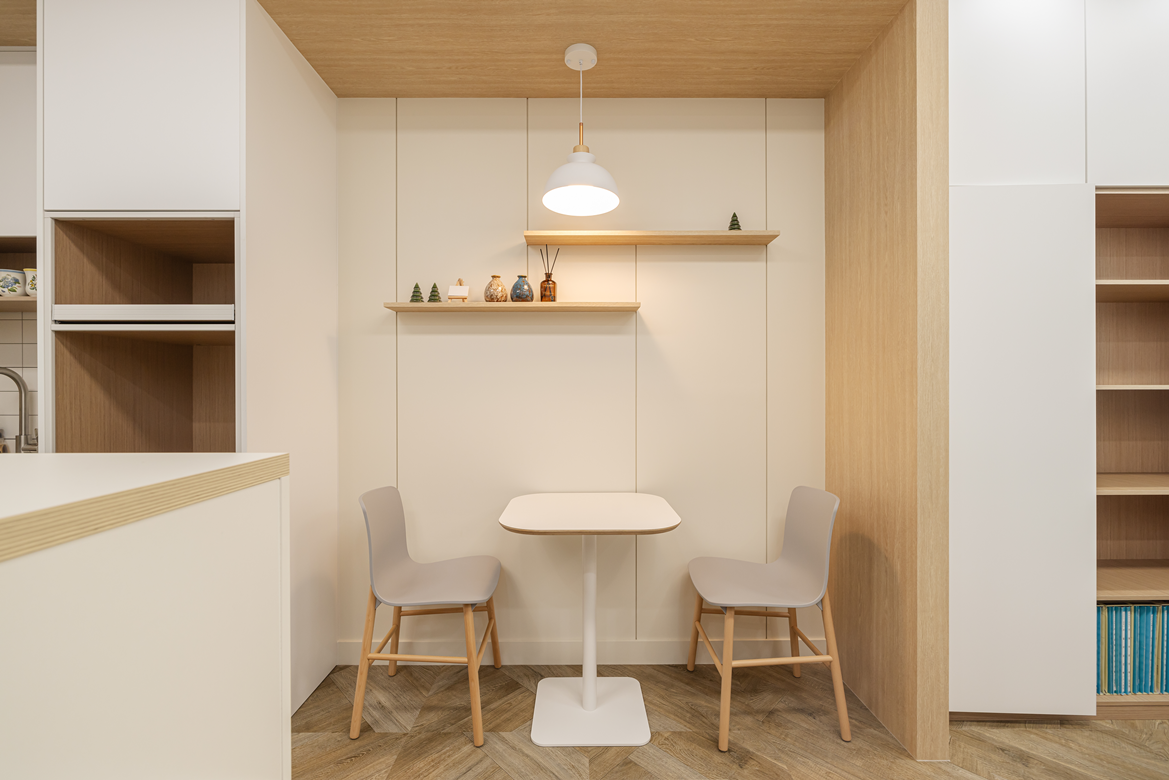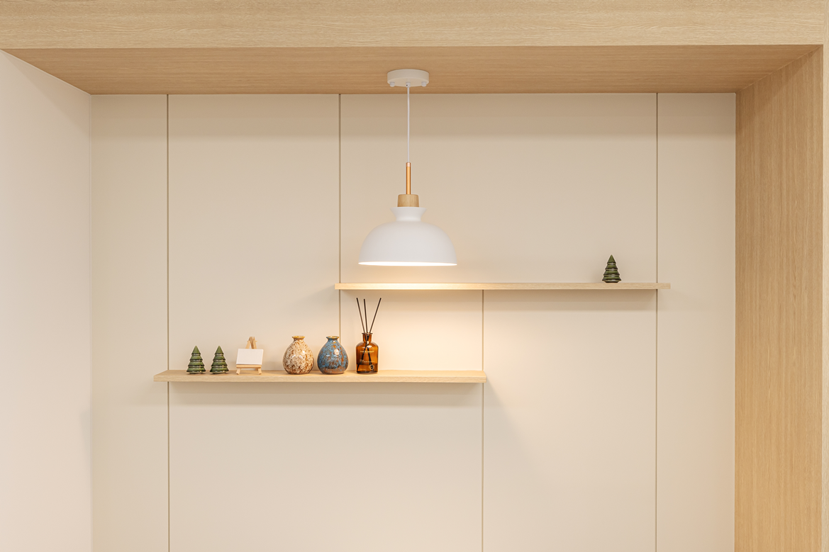 벽면 일부에는 우드 패널로 포인트를 주고, 조명은 따뜻한 색감의 매입등과 펜던트 조명을 적절히 혼합해 공간에 깊이감을 부여했습니다.