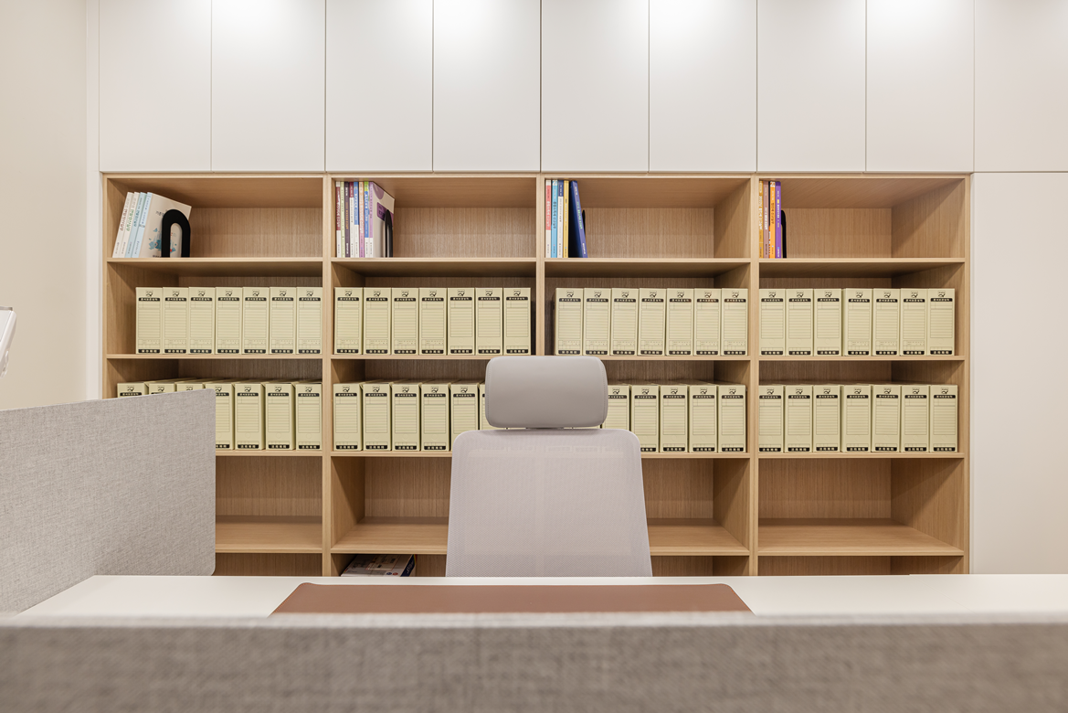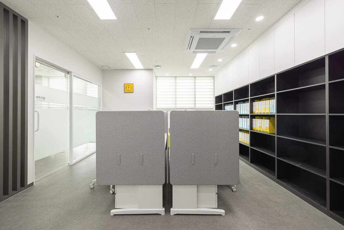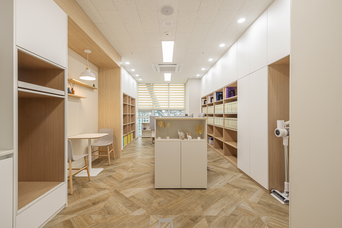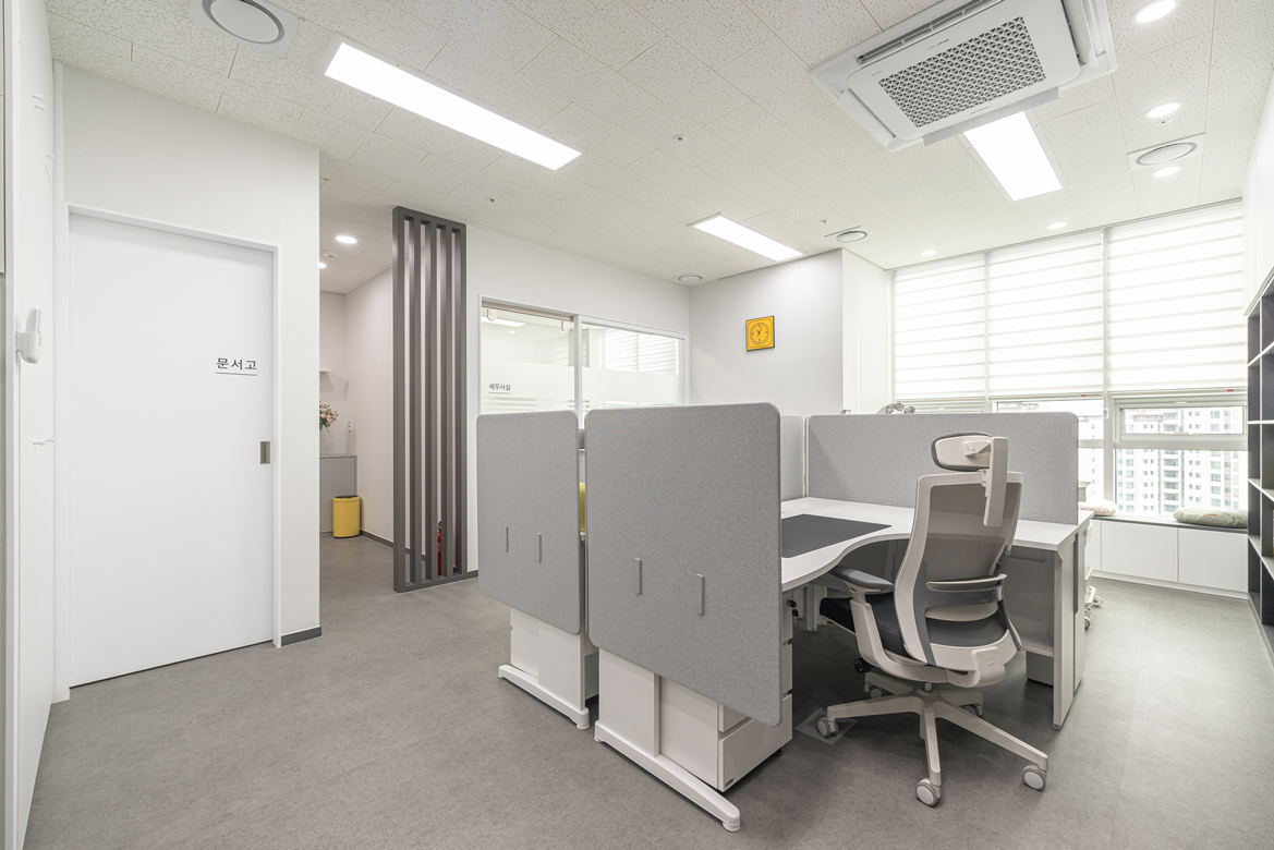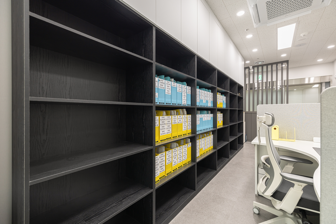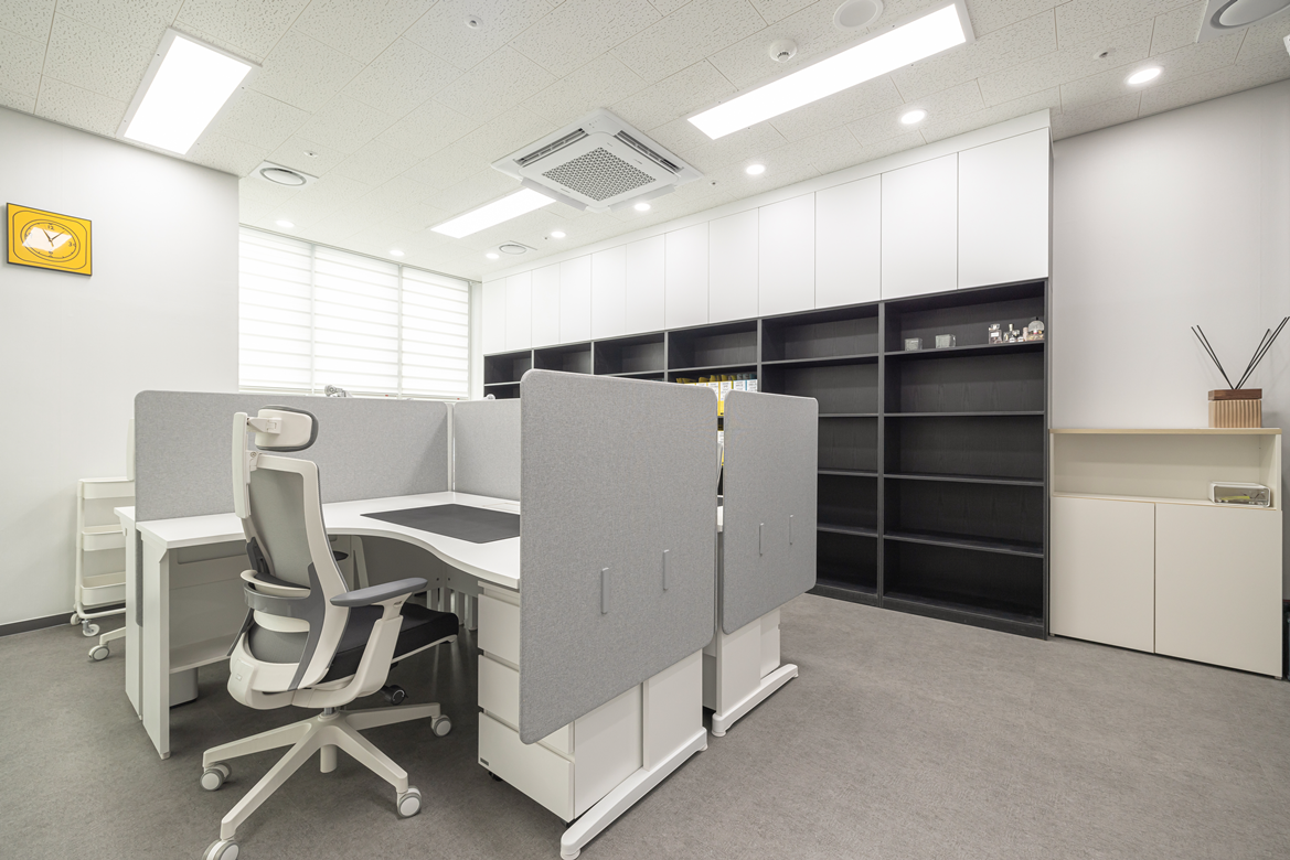 공간활용의 효율성도 놓치지 않았습니다. 벽면 한쪽에는 수납장을 설치하여 사무실에 필요한 서류나 문서 등을 정리할 수 있도록 설계하였으며, 서류 및 용품 정리가 용이한 동선을 고려해 배치했습니다.