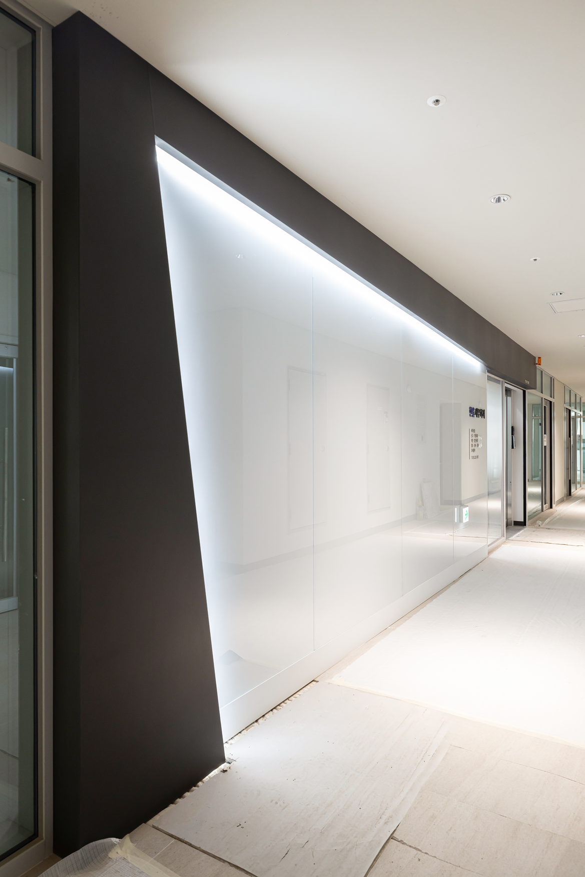 또 다른 입구 파사드는 블랙 프레임으로 세련되고 미니멀한 외형으로 구성했습니다. 프레임 내부에는 간접 화이트 조명을 삽입하여