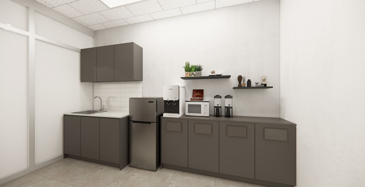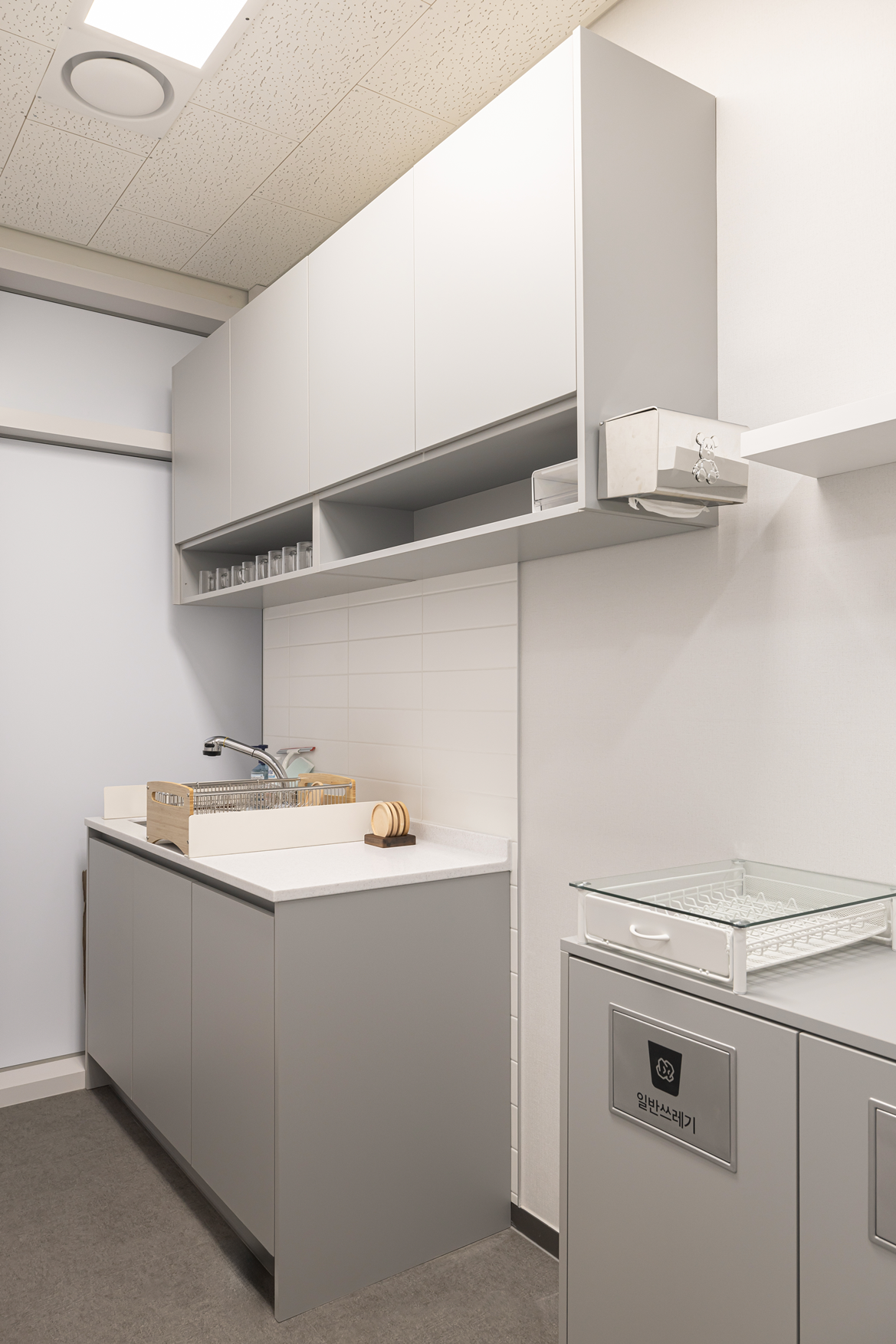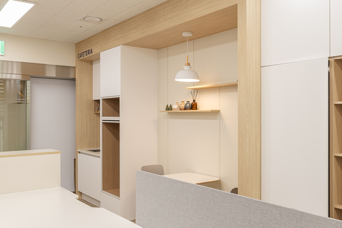 탕비실 역시 업무 환경의 연장선으로 보고 실용성과 디자인 모두 고려한 형태로 구성하였습니다.