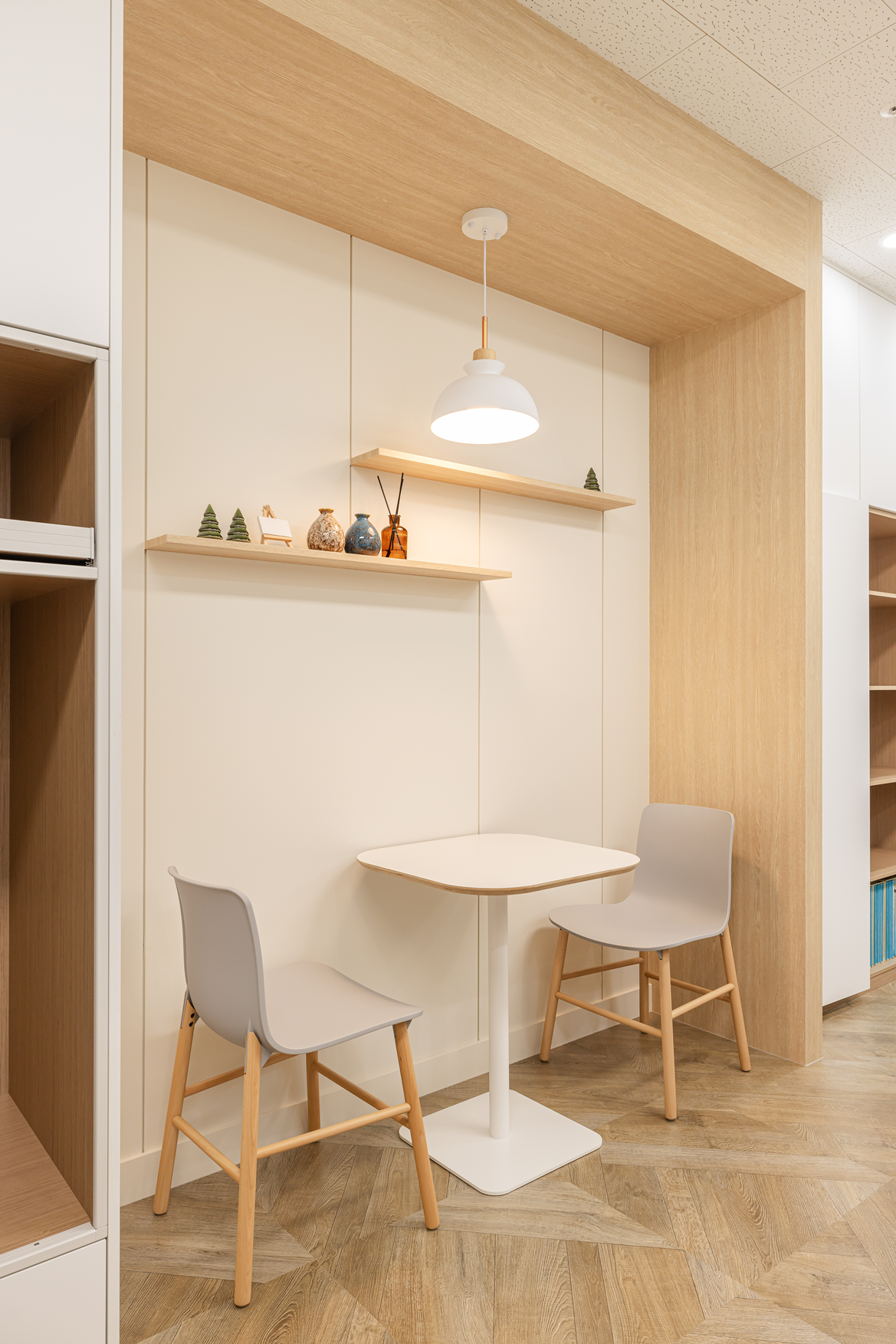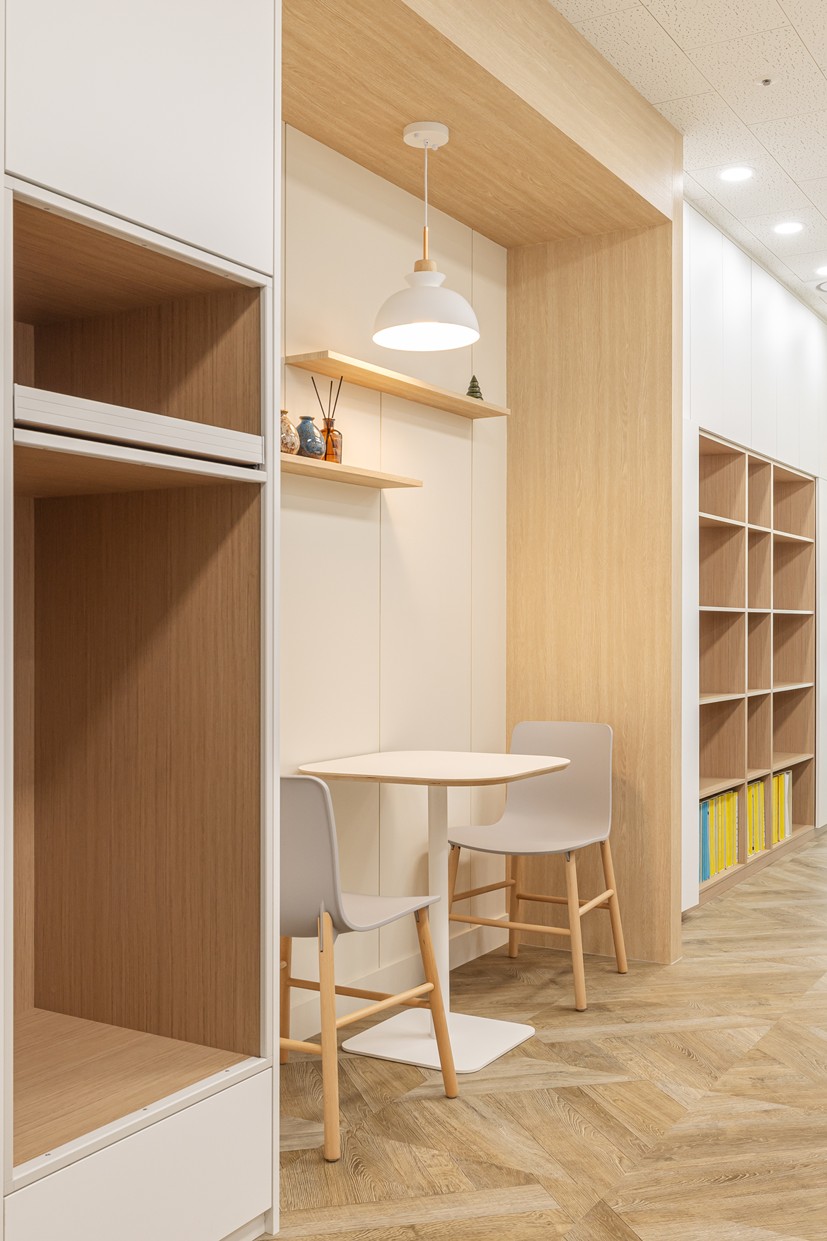 이 공간은 직원 휴게 공간 또는 소형 미팅룸으로도 활용 가능한 멀티 공간으로 기획되었으며, 트렌디한 분위기 속에서