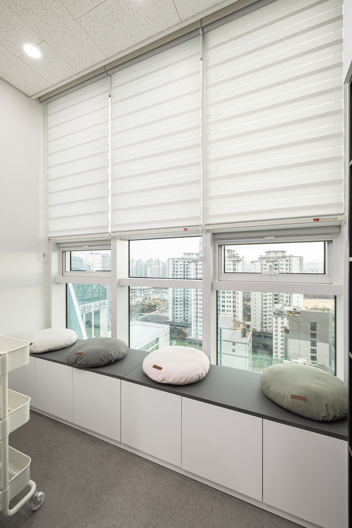 벽면과 천장은 화이트톤 중심의 도장 마감으로 깔끔하게 마무리했고, 바닥은 내구성 좋은 그레이톤 데코타일을 시공하여