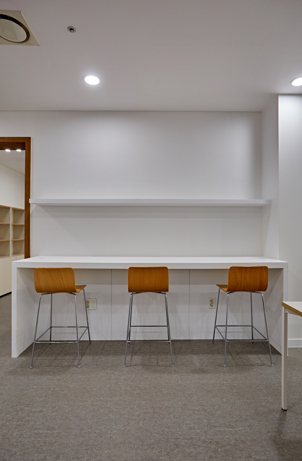 우선 우드와 화이트 조합은 자극적인 색상이 아니기 때문에 직원들이 안정감을 느낄 수 있어요.