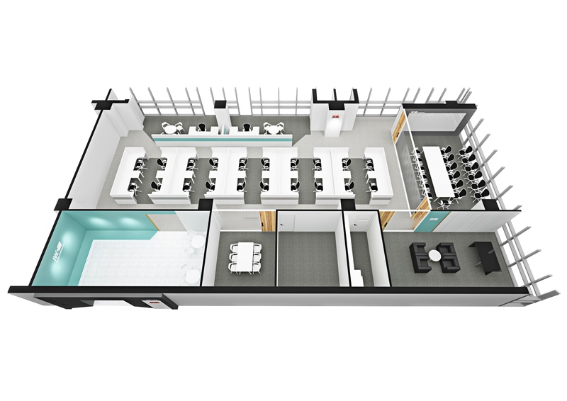 먼저 ISO 를 통해서 보여드리겠습니다. 사무실을 위에서 본 전경입니다. 전체적으로 화이트톤을 이용해서 디자인 한 것이 돋보이며 중간중간마다 민트색을 이용해서 색감의 독창성을 가미해보았습니다. 이는 화이트톤만 있어서 자칫하면 밋밋할 수 있는 사무실의 전체적인 분위기 안에서 전환을 시킬 수 있는 하나의 중요 포인트이기도 합니다. 분리된 공간 같은 경우에는 우드톤을 이용한 문을 설치해서 공간의 분리성을 나누어 보았습니다.
