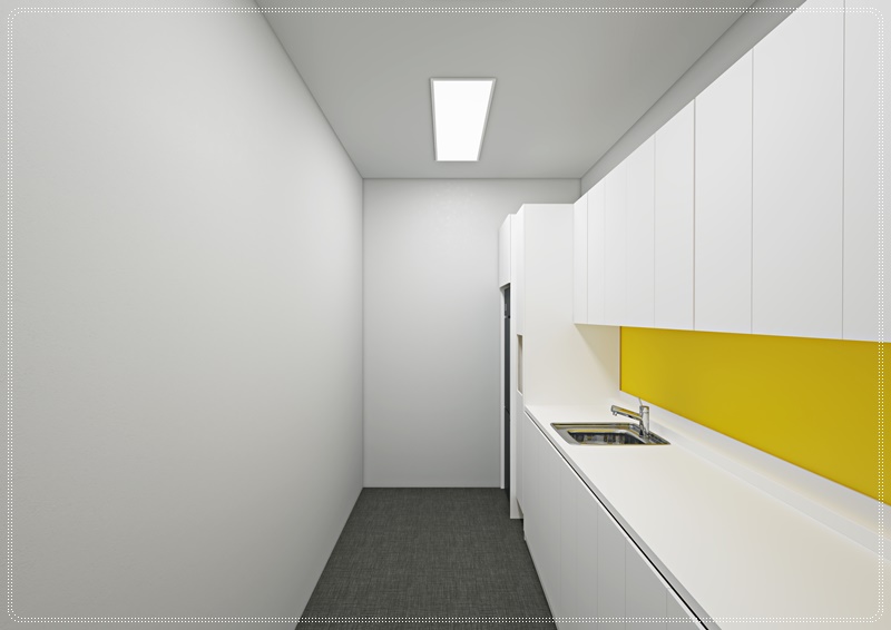 탕비실의 보습입니다. 직원이 업무를 보다가 가끔식 사용할 수 있게 정수기와 싱크대를 배치하였고 전체적으로 화이트톤을 이용하여 깔끔하게 배치해보았습니다.